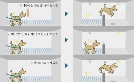 시간이 흘러서 새로운 상자로 개들을 이동시켰습니다. 이번에는 세 그룹을 한꺼번에 모았고 중간에 파티션을 쳐서 넘어갈 수 있도록 했습니다. 다시 전류를 흐르게 하였더니 세 그룹의 개들은 어떻게 반응했을까요? 코로 버튼을 눌러 전류를 멈추게 했던 1그룹의 개들은 전류가 흐르자 파티션을 뛰어 넘어갔습니다. 아무런 자극을 주지 않았던 개들도 역시 파티션을 뛰어넘었죠.