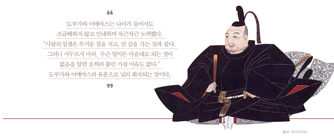 사람의 일생이란 무거운 짐을 지고 먼 길을 걷는 것과 같다. 서두르면 안 된다. 무슨 일이든 마음대로 되는 것이 없다는 것을 알면 굳이 불만을 가질 필요가 없다. 마음에 욕망이 생기거든 곤궁할 때를 생각하라. 인내는 무사장구(無事長久)의 근본, 분노는 적이다. 승리만 알고 패배를 모르면 해가 자기 몸에 미친다. 자신을 탓하되, 남을 나무라지 마라. 미치지 못하는 것은 지나친 것보다 낫다. 모름지기 사람이란 자기 분수를 알아야 한다. 풀잎 위의 이슬도 무거워지면 떨어지기 마련이다
