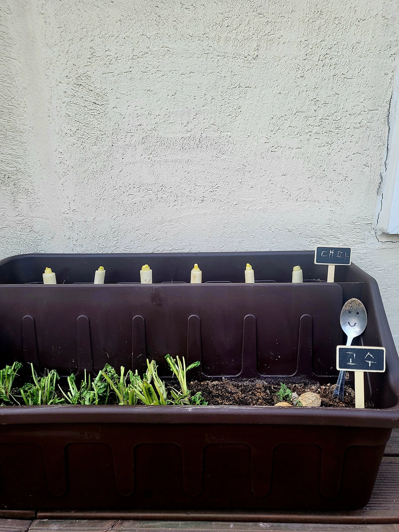 목식당과 CU 편의점 사이 창고 앞, 플라스틱 화분에 푸른 고수와 하얀 대파가 모심기하듯 나란히 심어졌다. 은빛 수저는 무엇이 좋은지 잔뜩 모래를 머리에 묻힌 채 웃고 있다. 그것들은 누군갈 마냥 기다리고 있는 모양이었다. 기다리는 일이 그들의 의무인 것처럼 묵언수행을 하는 건 아닐까.
