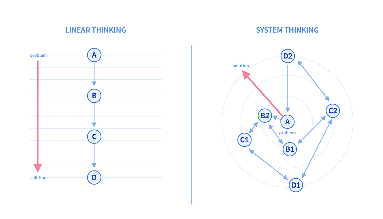 선형적 사고가 문제-해결책의 관계를 단계적으로만 살피는 반면 시스템 사고는 선택지의 모든 루트 간에 관계를 파악한다.