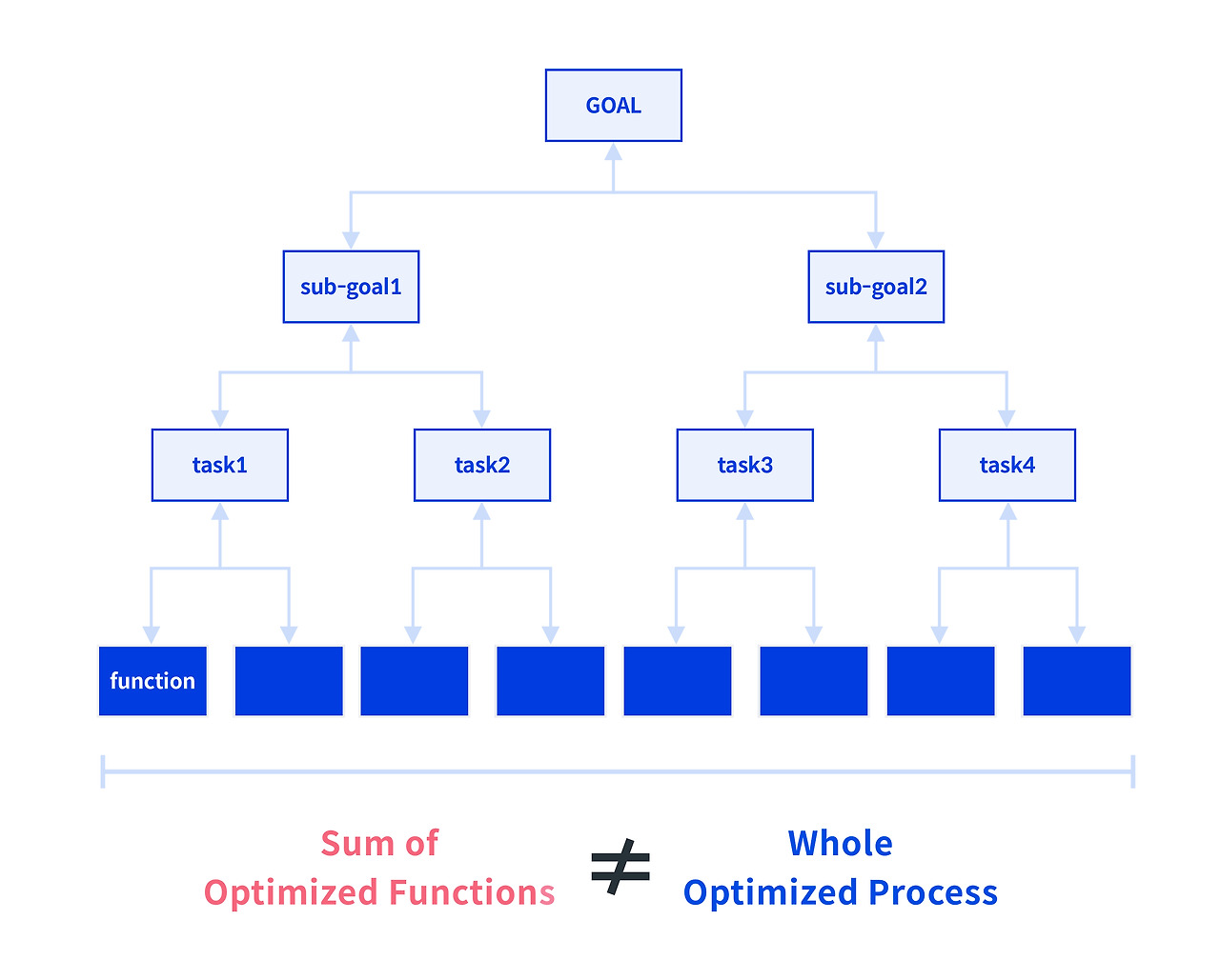 전체 프로세스의 최적화는 세부 과업들의 상호작용으로 정해지며, 각자의 목적에만 최적화된 기능의 합과 다르다.