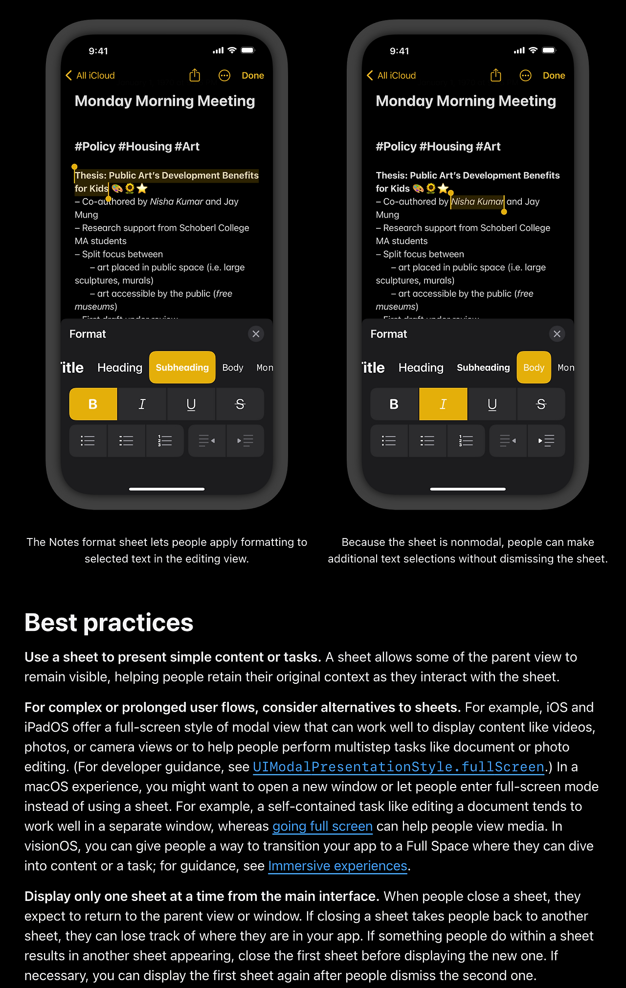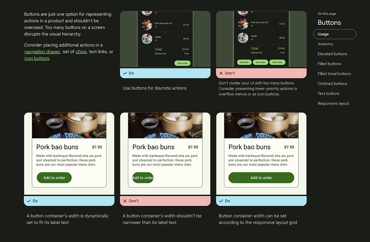 간혹 디자인 시스템에서 추구하려는 개성이 플랫폼의 가이드라인과 상충하는 경우도 있지만 적어도 디자인 시스템에 참여하는 디자이너라면 이미 익숙한 컴포넌트들이라도 어떤 의도에서 개발되고 작동하는지를 한번 정도는 해당 플랫폼의 가이드라인을 훑어보는 것을 추천합니다. material design의 가이드가 안드로이드와 웹 전체 플랫폼을 대표한다고 보긴 어렵지만 가이드에 각 컴포넌트별로 기본적인 스펙과 do / don't list를 알기 쉽게 제공하며, ios의 human interface guideline 또한 ios에서 사용되는 컴포넌트들의 세세한 가이드를 제공하고 있습니다.