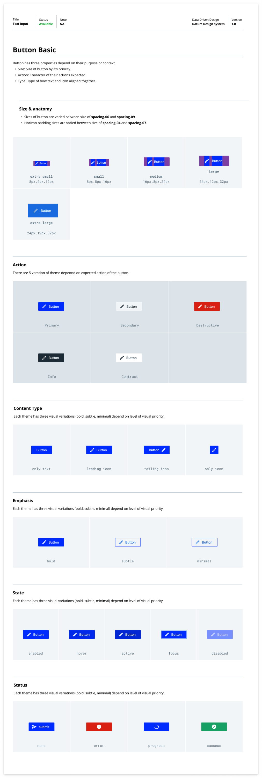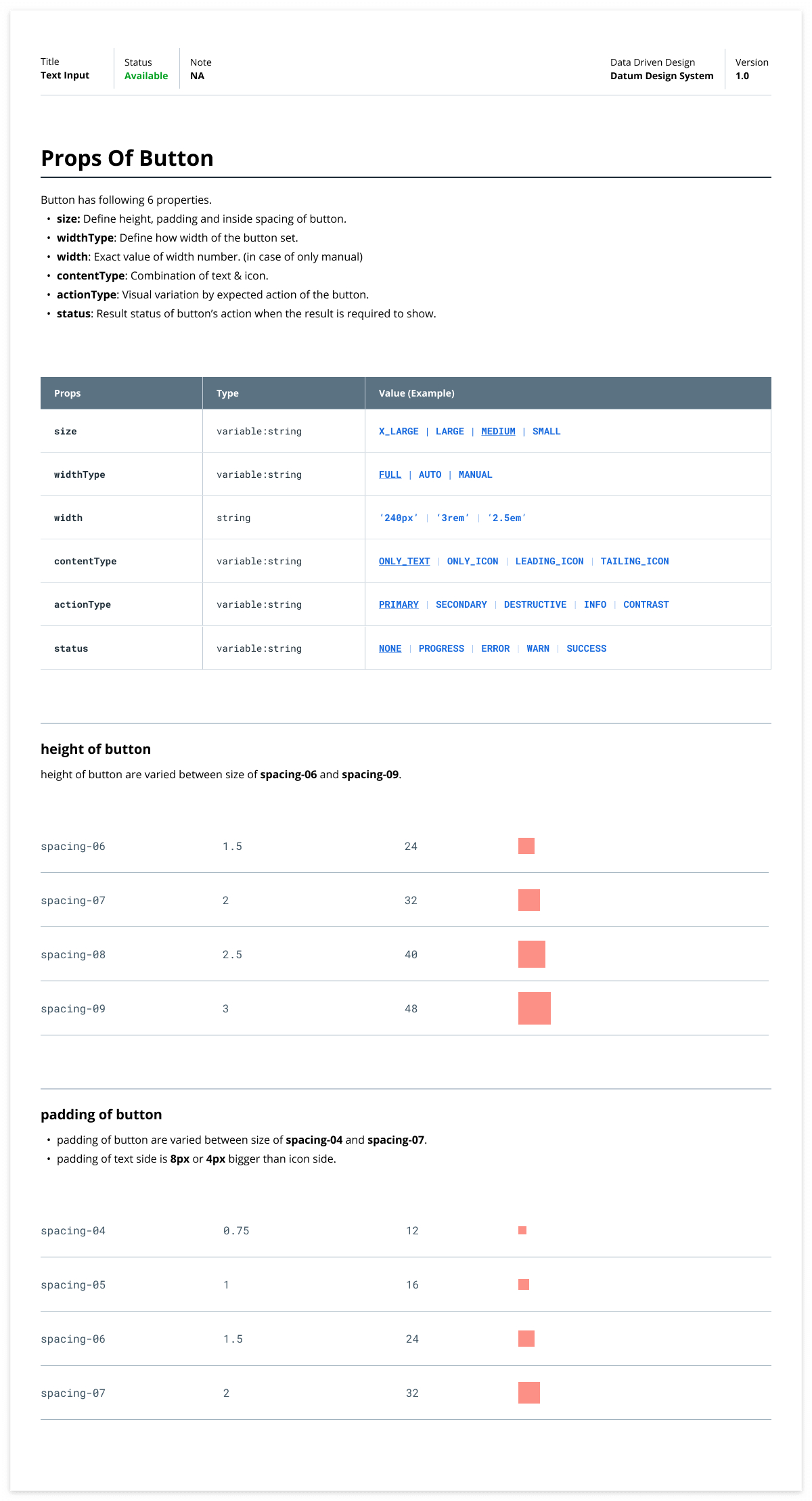 때문에 디자인 시스템을 구축하는 과정에서 생각보다 문서 작업을 많이 하게 됩니다. 저는 비슷한 이유에서 디자인 토큰을 구성할 때도 카테고리부터 스프레드시트에 먼저 정리하는 습관을 들이며, 데이터 모델 또한 와이어 프레임과 ux flow가 나온 시점에서 페이지 단위로 필요한 데이터 모델을 정리하고, 그 이하의 것들은 디자인 가이드의 props에 세부적으로 명시합니다. 이러한 방식으로 작업을 하면 개발사이드에서 프런트 기획과 DB 설계 및 백엔드 api 기획에 관련된 예비동작을 할 수 있다는 프로세스적인 장점도 있습니다.