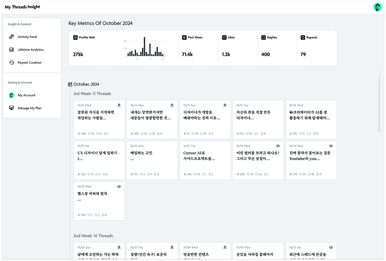 스레드를 퍼스널 브랜딩의 수단으로 생각하는 사람들은 최근 본인이 썼던 글들의 퍼포먼스를 가장 궁금할 것이라 생각했습니다. 그래서 최근 활동 피드에서는 월단위로 쓴 글들을 그리드 형태로 보여주되 상단에 주요 지표들을 요약해서 각 글들이 어느 정도 기여를 했는지도 같이 비교할 수 있도록 했습니다.