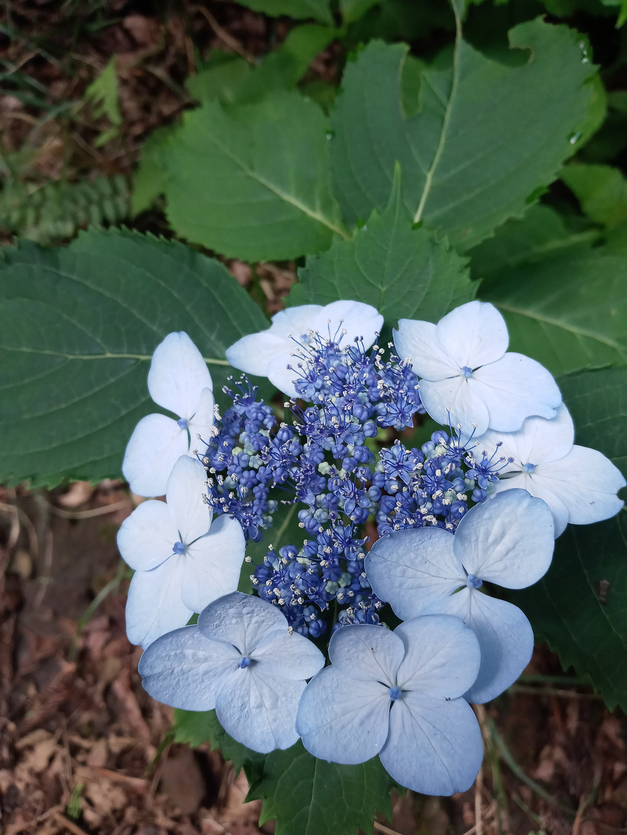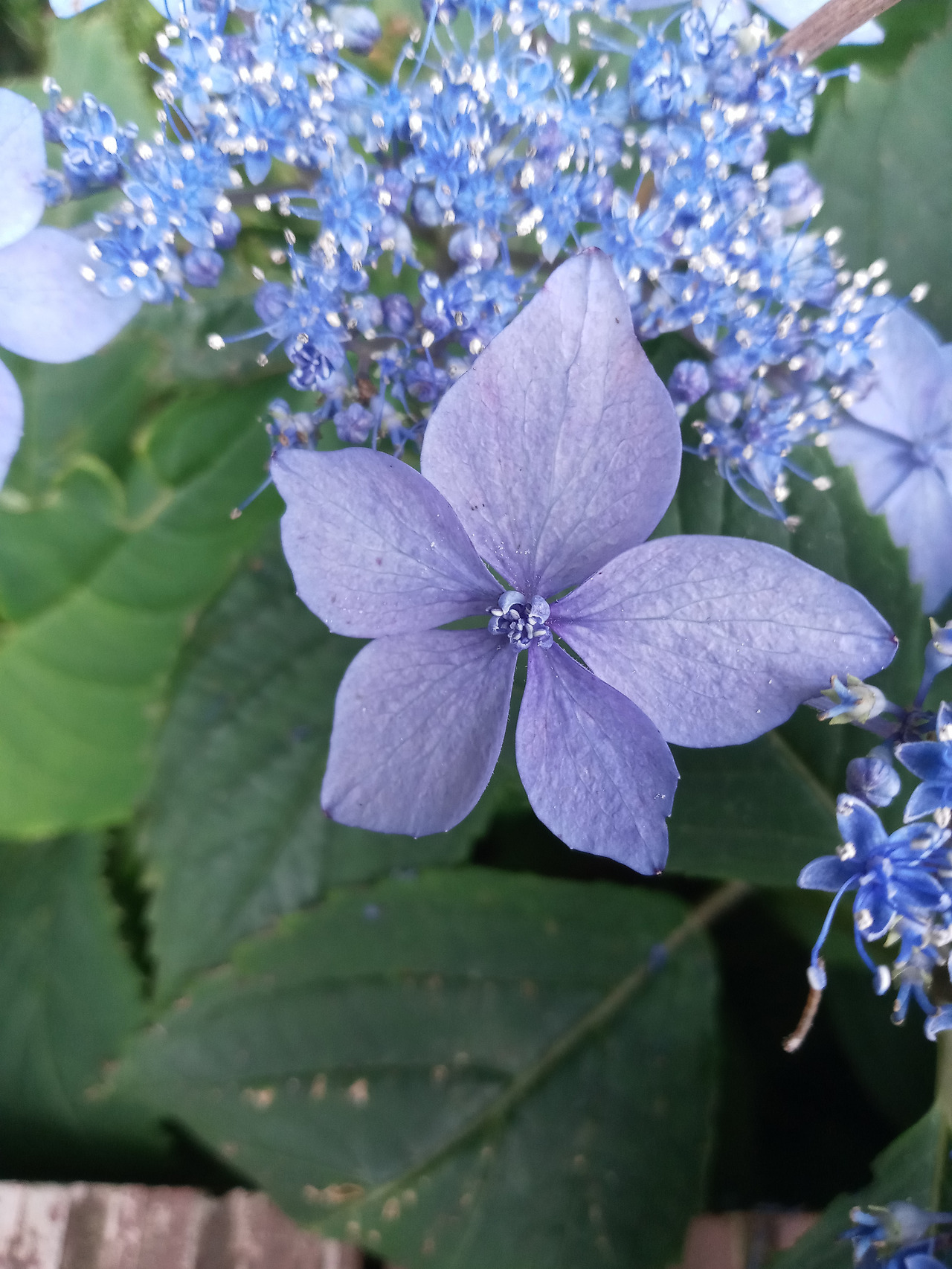 가짜꽃에 꽃술을 달고 있는 한라산수국, 꽃잎이 무려 여섯 장이다.
