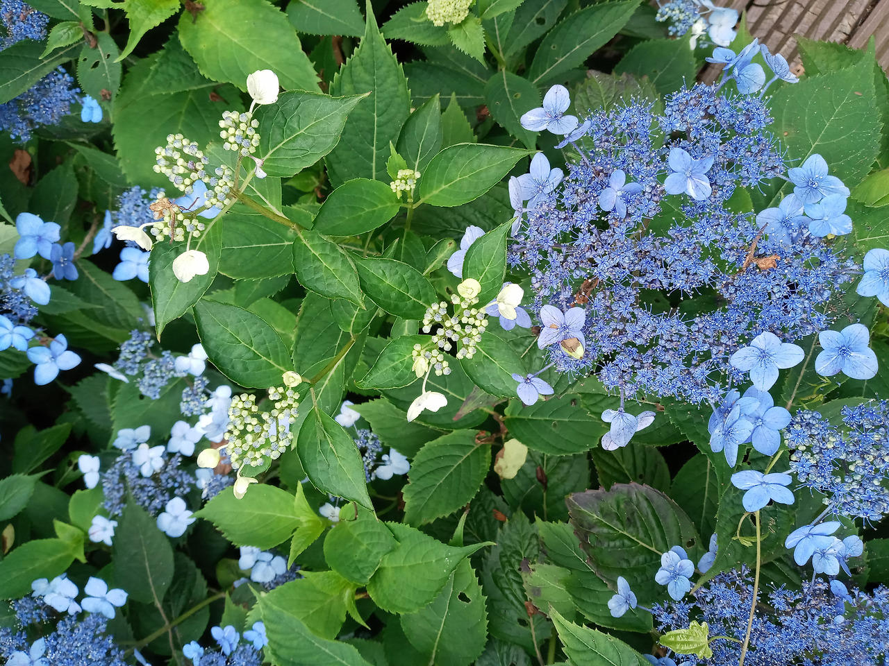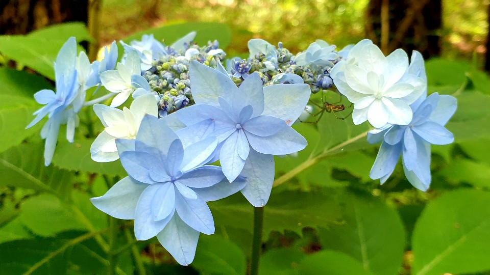 산수국 색깔은 주로 가짜꽃 색깔이다. 그런데 이 색깔도 다 같은 게 아니다. 자료에 의하면 토양의 성질에 따라 색상이 달라진다고 한다. 산성 토양이면 푸른 색 계통, 염기성 토양이면 붉은 색 계통, 중성일 때는 흰색을 띤다고 되어 있는데, 내가 자세히 살펴 본 바로는 좀 이상하다. 한 뿌리에서 나온 꽃들도 각기 다른 색을 띠고 있다.