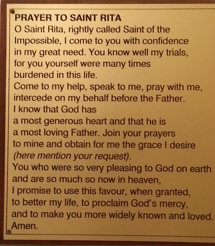 좌절하고 실망한 이들의 수호성인, 불가능함의 성인이라 불리울 정도로 어렵다고 포기할 만한 큰 문제들을 하느님께 전구 해준다는 리타 성녀. 이 성인의 모습과 기도문을 보는 순간 내 마음에는 크고 강한 희망의 빛이 들어왔다.
