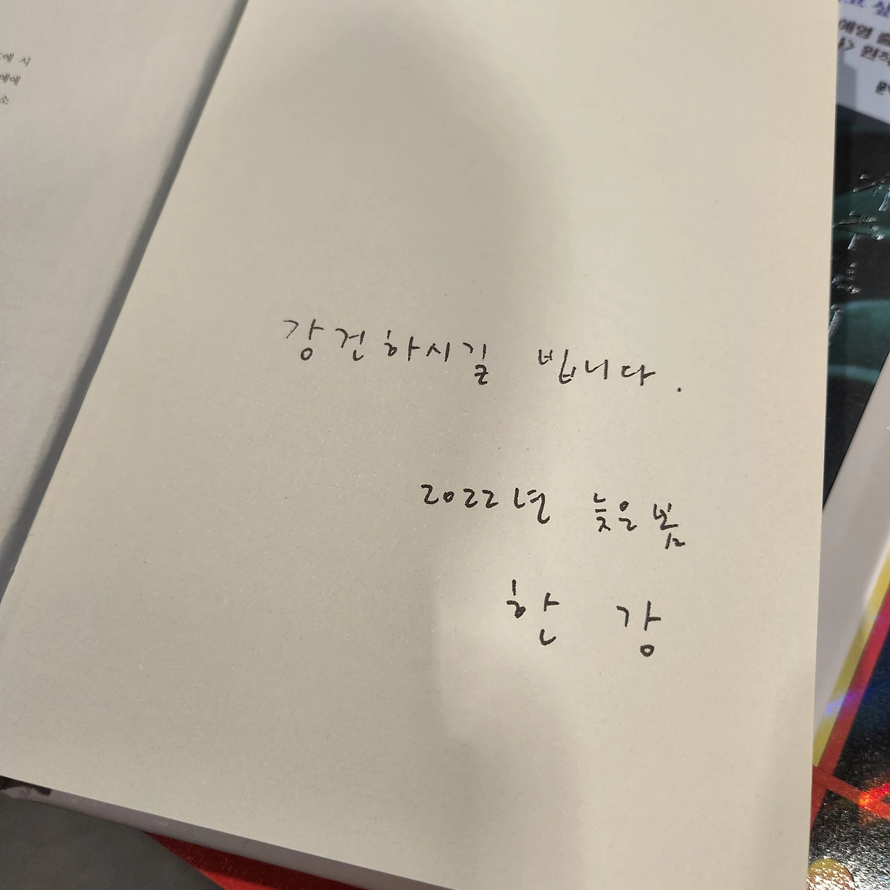 교보문고를 갔다. 한강의 책을 사고 싶었는데, 돈도 시간도 없어서 사지 못했다. 새로운 알바를 구할 힘도 여력도 없으니 아마 당분간 조금 더 몸도 마음도 가난한 사람으로 지내지 않을까 싶다. 해야 하는 일들이 꽤나 많으니 그것들만 하고 지내도 순식간에 개강할 것만 같아서 슬프군. 아무튼 한강은 정말 천재고, 그처럼 글을 쓰고 싶습니다. 한국 문단에 계셔서 너무 감격스러운 천재. 책을 펼쳐 들었는데 인쇄된 사인이 있어 사진 찍어 두었습니다.