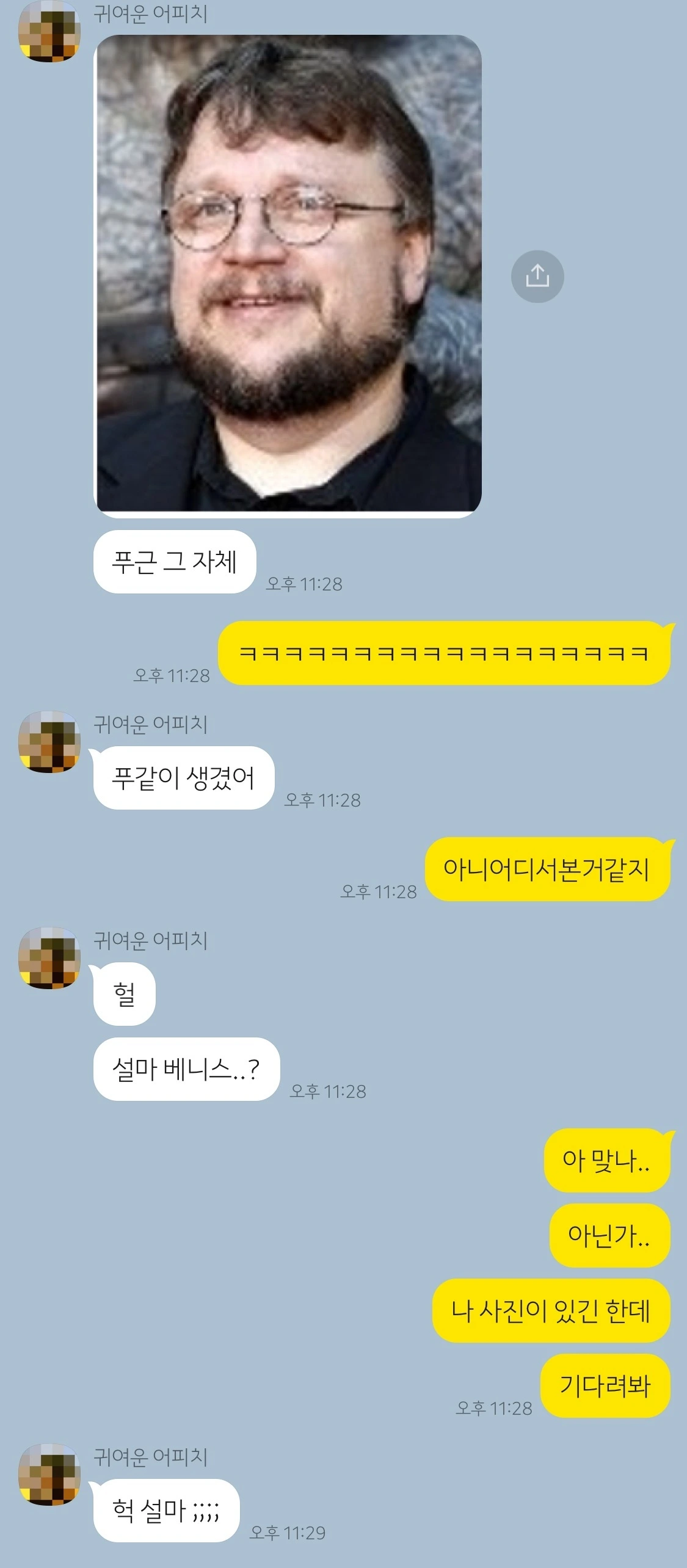 아무튼 그렇게, 영화를 추천해 준 친구와 함께 영화에 대해서, 또 감독에 대해서 카톡을 나눴다. 그런데 이 얼굴, 수염으로 뒤덮인 둥그스름한 기예르모의 얼굴이 왠지 모르게 낯이 익은 거다. 친구와 카톡을 하는 내내 기예르모의 얼굴에서 강력한 기시감을 느꼈다.