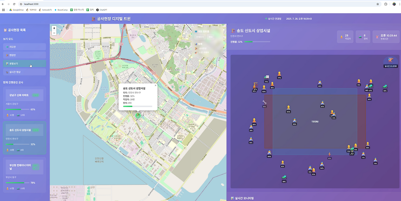 프론트엔드 개발을 시작할 때 가장 고민했던 부분이 "어떻게 실시간으로 건설 현장을 시각화할 것인가"였습니다. 단순한 영상 스트리밍만으로는 약간 재미가 없었습니다. 그래서 저는 중장비의 위치와 위험 구역을 직관적으로 보여줄 수 있도록 몇가지 기능 및 UI/UX를 추가하였습니다. 처음에는 React 컴포넌트로 Leaflet 지도를 관리하는 구조를 만들었고, WebSocket을 통해 백엔드에서 전송하는 객체 탐지 결과를 실시간으로 영상에 반영했습니다.