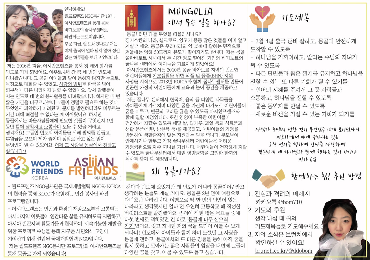 18살, 7년 전에 적은 버킷리스트를 얼마 전 발견했다. 이걸 보여주니 어떤 친구는 이루지도 못할 거 왜 적었냐고 타박(?)도 했지만 결국 이루게 됐다. 원래 하고 싶은 일이나 이루고 싶은 일이 있다면 입 밖으로 꺼내라 하지 않는가. 이걸 적었기에 내가 가게 되는 것이 아닐까도 싶다. 2019년 3월 4일, 나는 몽골에 간다. 나무를 심는 일도 앞으로 내가 해야 할 많은 일들 중 하나가 될 것이다.