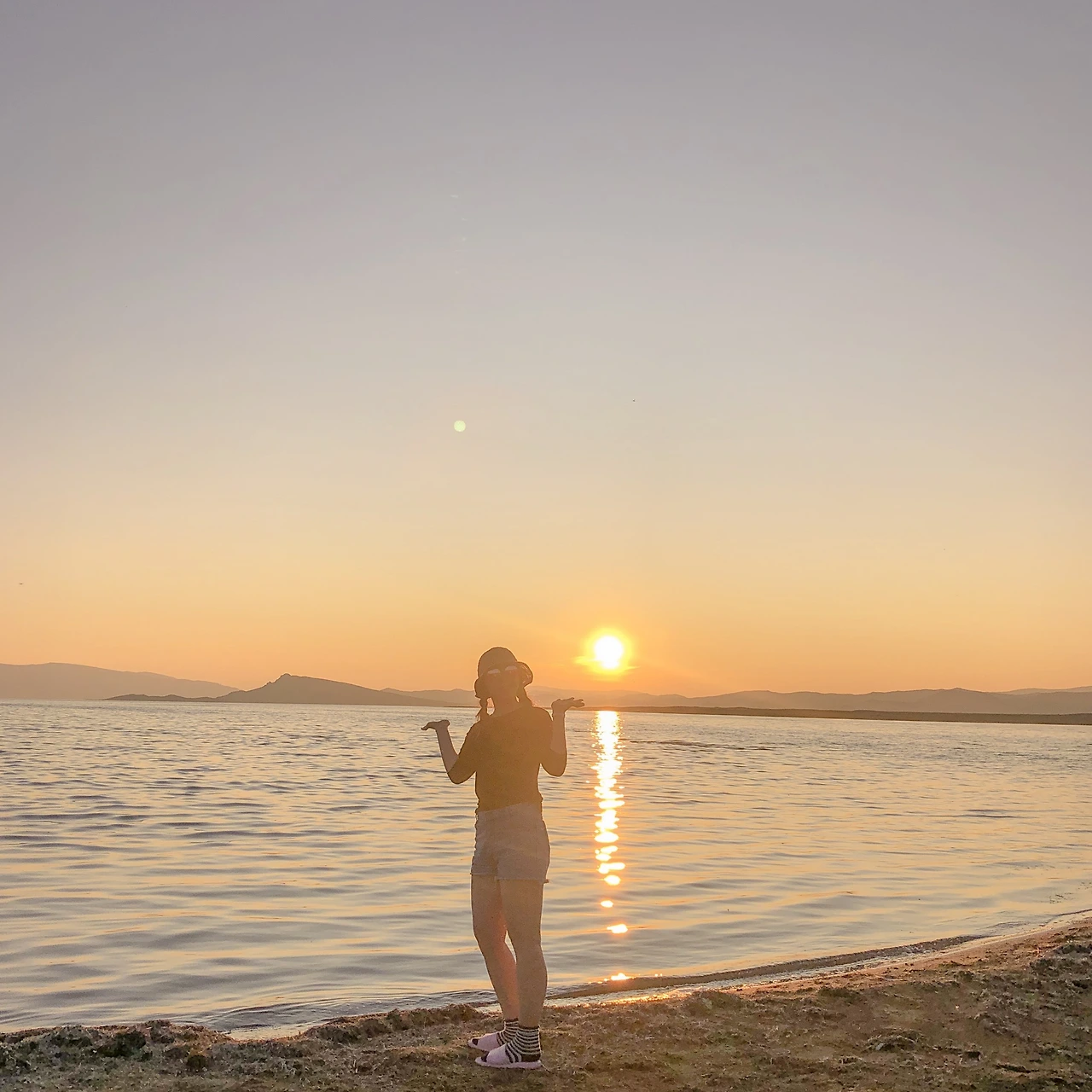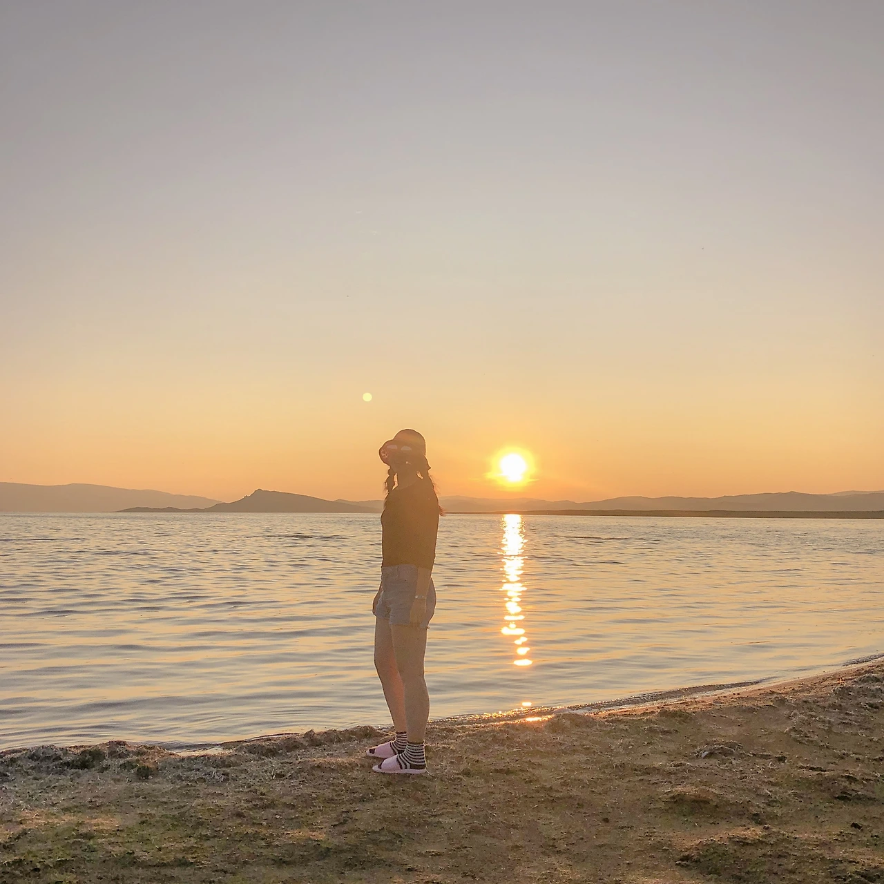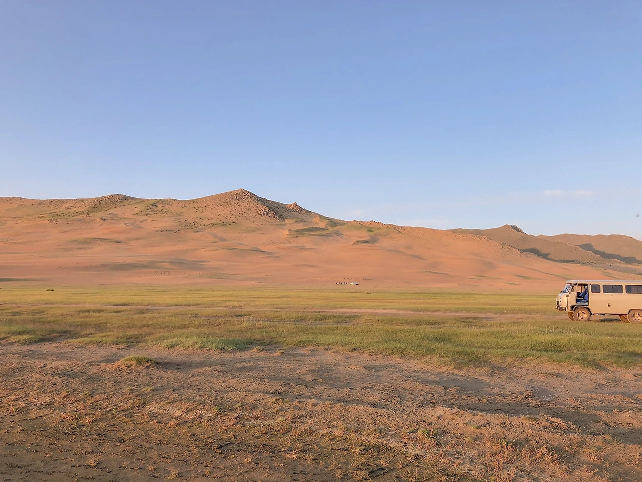 따뜻한 색으로 해가 지는 모습. 차에만 너무 오래 있었더니 몸은 고단했지만 일몰을 보니 정신이 말짱 돌아왔다! 차에 앉아만 있던 우리보다는 운전에 집중하던 기사님이 더 힘드실 게 분명하지만ㅠㅠㅠ 사진은 저녁 6시쯤으로 보이지만 사실 9시가 훌쩍 넘은 시간이었다. 게르 캠프에 도착하고, 경치를 구경하고, 짐을 풀고 정리하다 보니 저녁 식사는 11시가 넘어서 시작했다. 피곤했지만 여행 중에 처음으로 하늘이 맑은 날이라 다 같이 별을 바라보다 사진을 찍고 잠에 들었다.