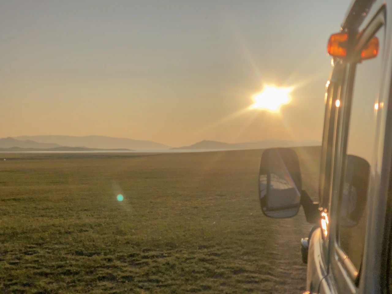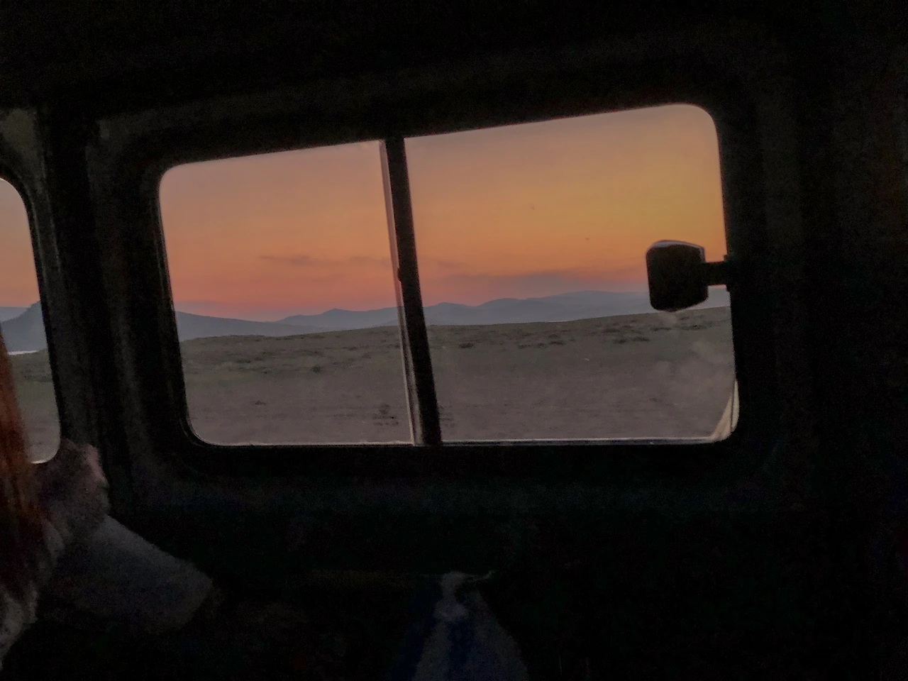 푸르공 창문을 통해 보는 일몰. 아무리 흔들리는 차 안이어도 해가 지는 모습에 집중할 수밖에 없었다.