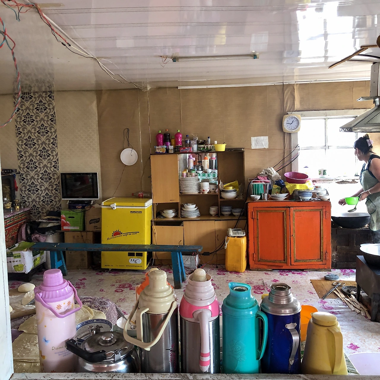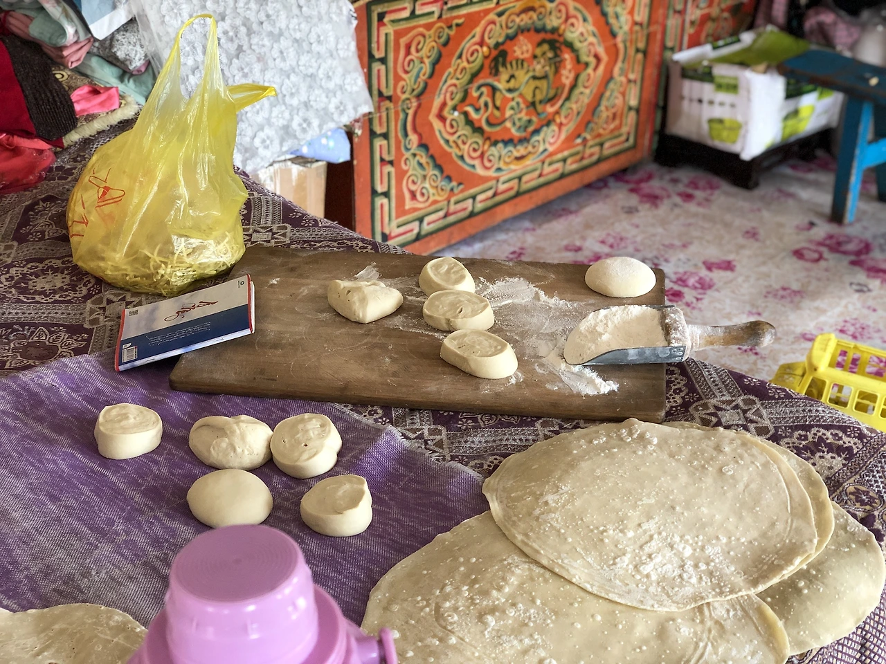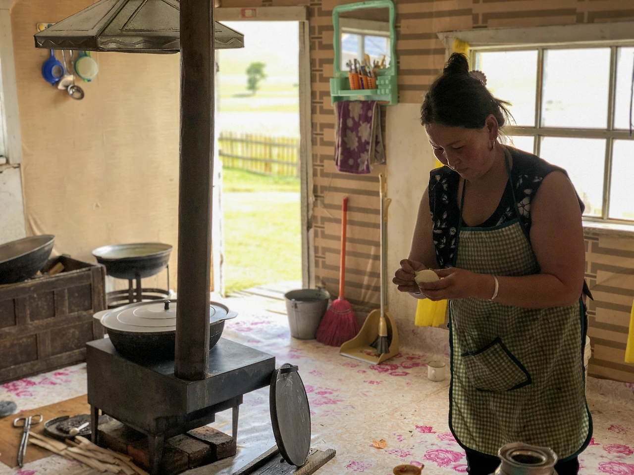 음식 준비하는 모습이 궁금해서 창문을 넘어다 보았다. 몽골 전통 음식인 초이왕과 보쯔를 만드는 모습. 초이왕은 볶음면, 보쯔는 만두와 비슷하다. 두 가지 모두 채소는 박하게, 고기는 후하게 함께 들어가는 음식이다.