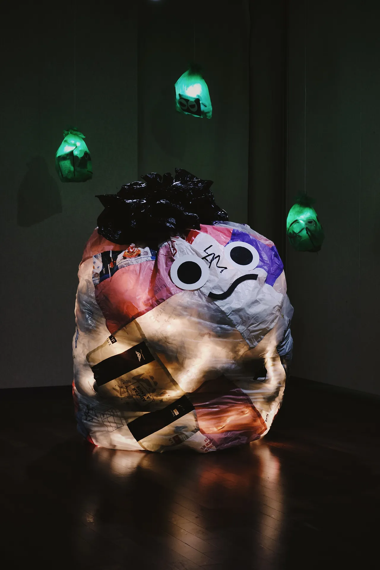 코로나 이후로 증폭한 배달음식과 제품을 포장하던 비닐들이 겹겹이 뭉쳐 거대한 비닐몬이 되었다.