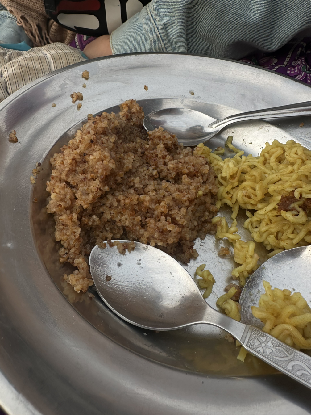 아침식사로는 매기라면과 달리아, 빵과 쨈을 먹었다. 그리고 짜이에 폭 담가 먹는 애기과자까지! 달리아는 뭔가 고소하면서도 단맛이 나는 퀴노아 같은 식감이었는데 매기라면과 함께 먹으니 단짠 조합이 최고였다. 어젯밤에는 그렇게 배부르다 해놓고 아침을 너무 잘 먹은 스스로가 어이없었다... 아 그리고 여기서는 설거지를 모래로 한다. 세제 없이... 물 없이... 이것이 바로 친환경일까...? 왠지 음식 먹을 때마다 모래가 씹히더라니?