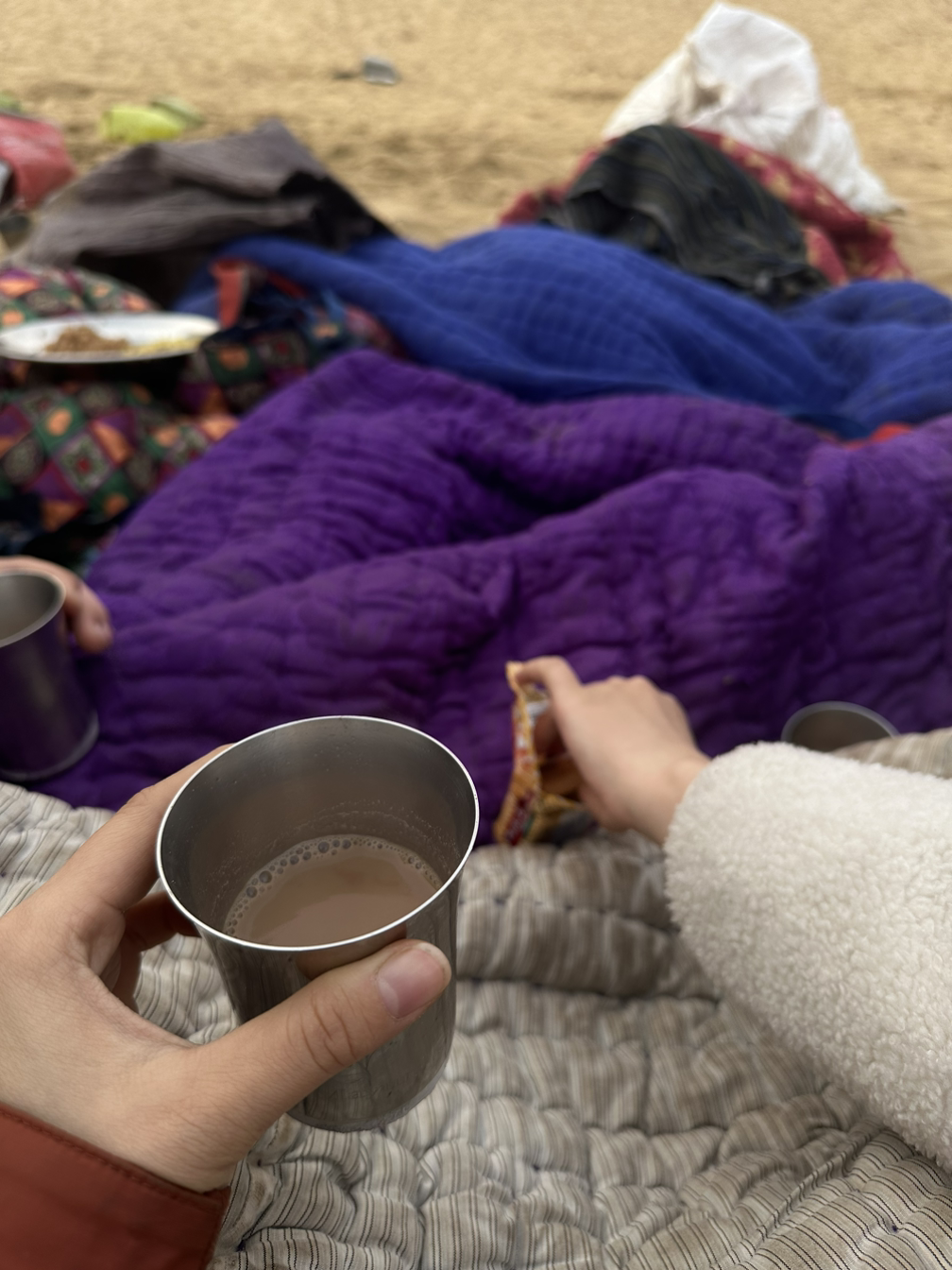 저녁까지 두둑이 먹고, 께릴라 사람들의 높은 텐션을 따라갈 수 없는 우리는 천막 안에 들어가 남은 밤을 보냈다. 과자를 먹으며 적당히 시간을 보내고 잠을 잤다. 모래 위에 두꺼운 담요가 한 장 깔려있고, 그 위에 누워 스카프 한 장을 덮고 잤다. 처음에는 생각보다 안 추워서 스카프 한 장으로 버티려고 했는데(심지어 핫팩도 나눔 했다...) 사막의 밤은 추웠다... 한 시간마다 한 번씩 깨고, 결국 뭔가 덮기에 찝찝한 담요를 두 개나 덮고 잤다. 백패킹 하면서도 이렇게 춥게 잔 적은 없었는데 말이다. 다음에 사막에 온다면 제대로 준비해서 와야지!