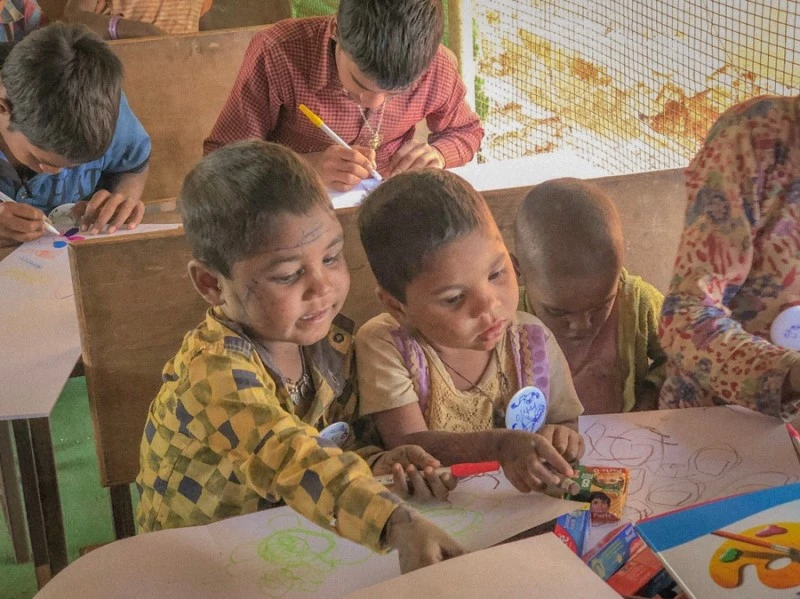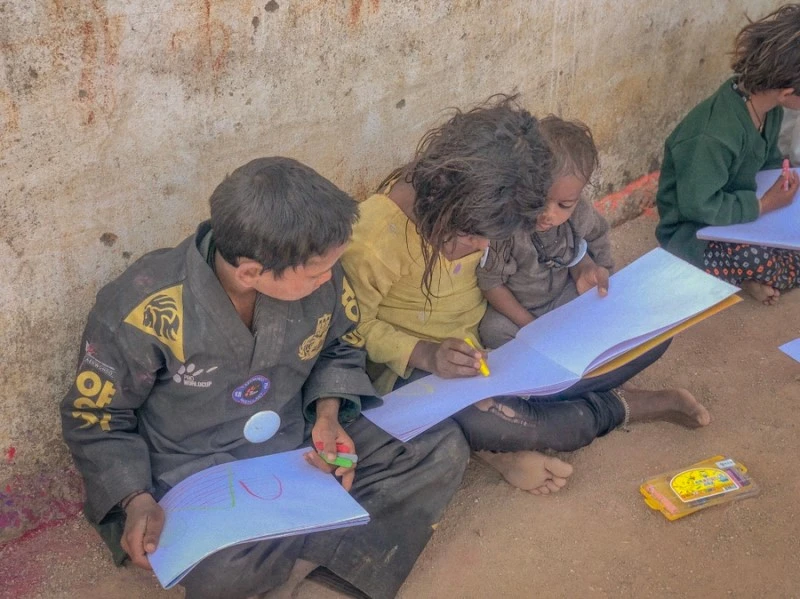 로티아나에서도 같은 활동을 했다. 찬드라반과 비슷하게 한 명이 뭔가를 그리면 다들 비슷한 그림을 그린다. 오른쪽 사진은 태극기를 그려주니 직접 색칠하는 모습이다. 로티아나 마을 학교는 기존의 닭장에 페인트칠을 하고, 칠판과 책상 등 기본적인 교실의 가구들을 들여놓아 만들었다. 좀 더 학교다운 학교가 만들어진다면 아이들이 더 좋은 환경에서 공부할 수 있을 것 같다. 물론 학교가 생긴다고 해결되는 일은 아니다. 그 부분에 대해서도 더 고민해봐야 한다.