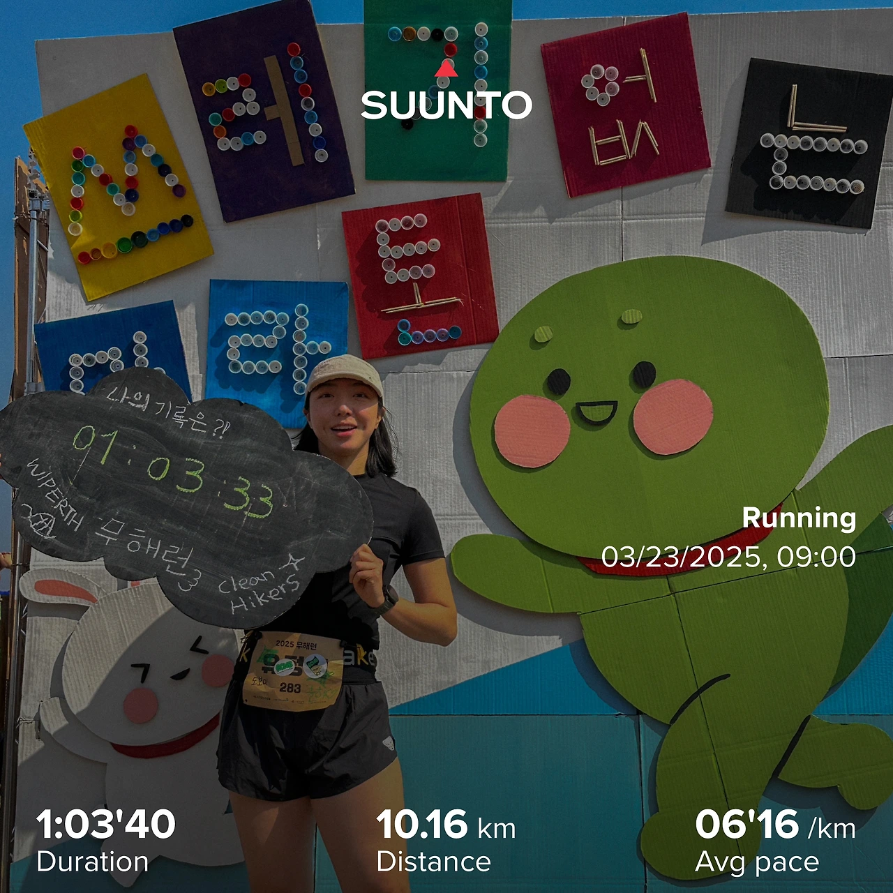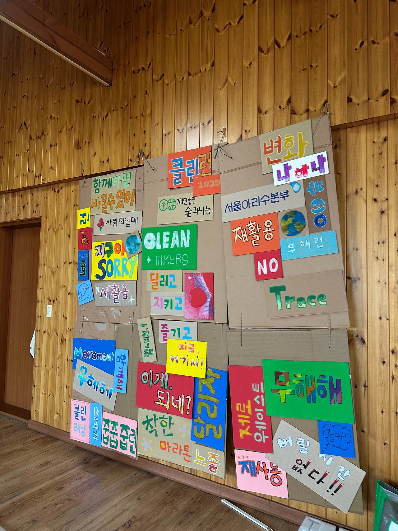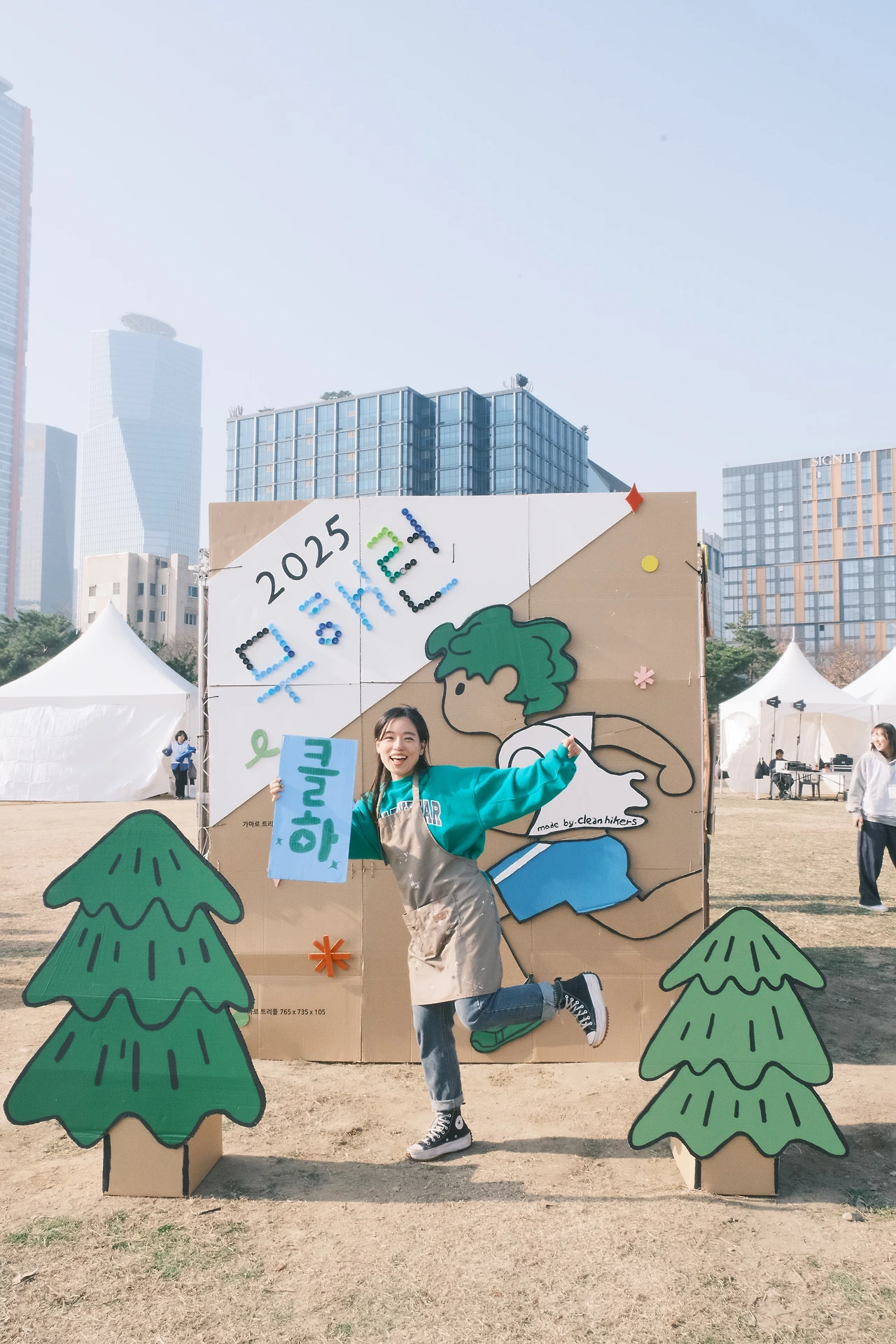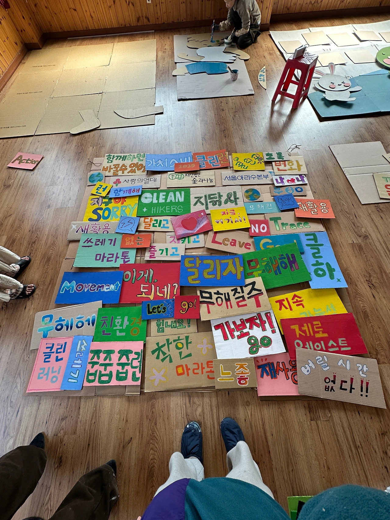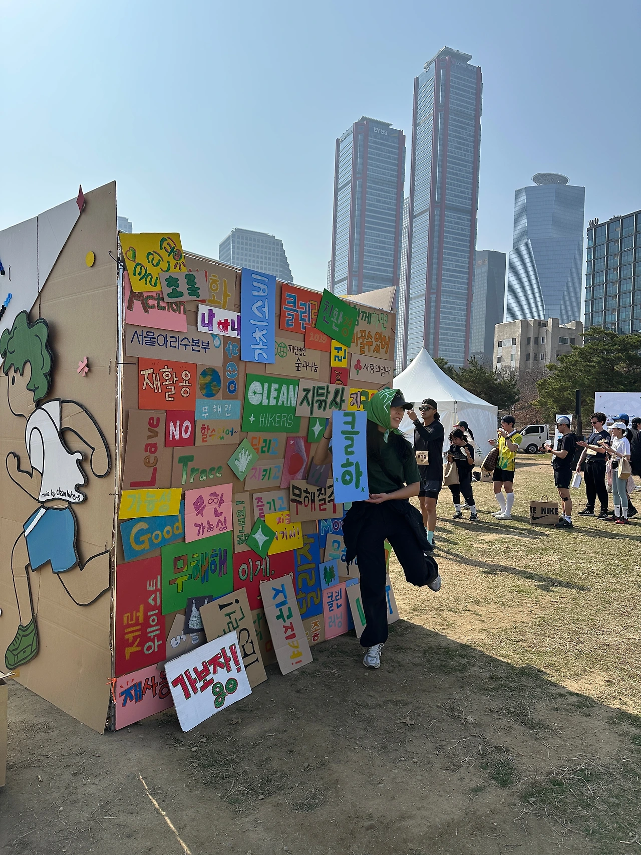 7시 반부터 부스 오픈이라 7시 10분쯤 행사장에 도착했다. 나름 일찍 온 줄 알았는데 이미 도착한 멤버들이 있어서 트러스는 정해진 위치에 옮겨져 있었고, 남은 할 일들을 후다닥 해치웠다. 병뚜껑과 나무젓가락으로 “쓰레기 없는 마라톤” 글자 만들기와 배경에 잘 붙이기!