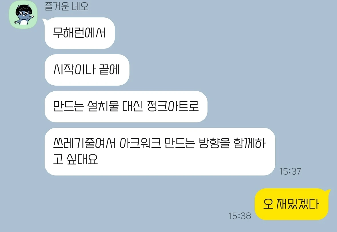 와이퍼스의 의진님, 희주님, 태웅님 세분과 클하 강은님, 나 이렇게 다섯 명이서 미팅을 진행했다. 포토존에 사면 트러스를 설치할 예정인데 각 면에 어떤 내용을 채우면 좋을지, 어떤 식으로 만들어낼지 등 한 시간 정도 이야기를 나눴다. 많은 단체에서 이번 무해런에 참여했는데 그중 하나가 우리 클하라 뿌듯하다.