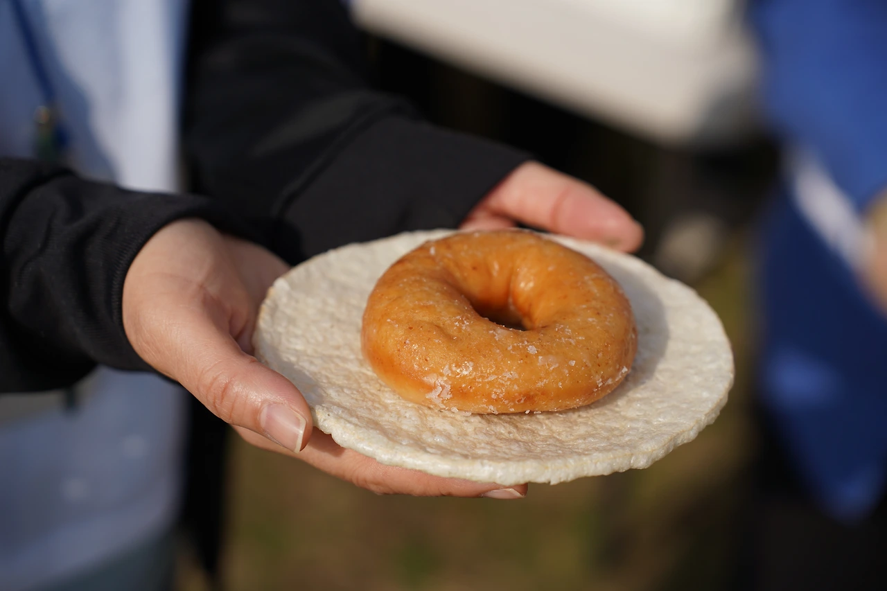 완주 후에 즐길 수 있는 메뉴들. 진정한 친환경 접시인 뻥튀기 위에 올려먹는 도넛이라니! 정말 훌륭하다.