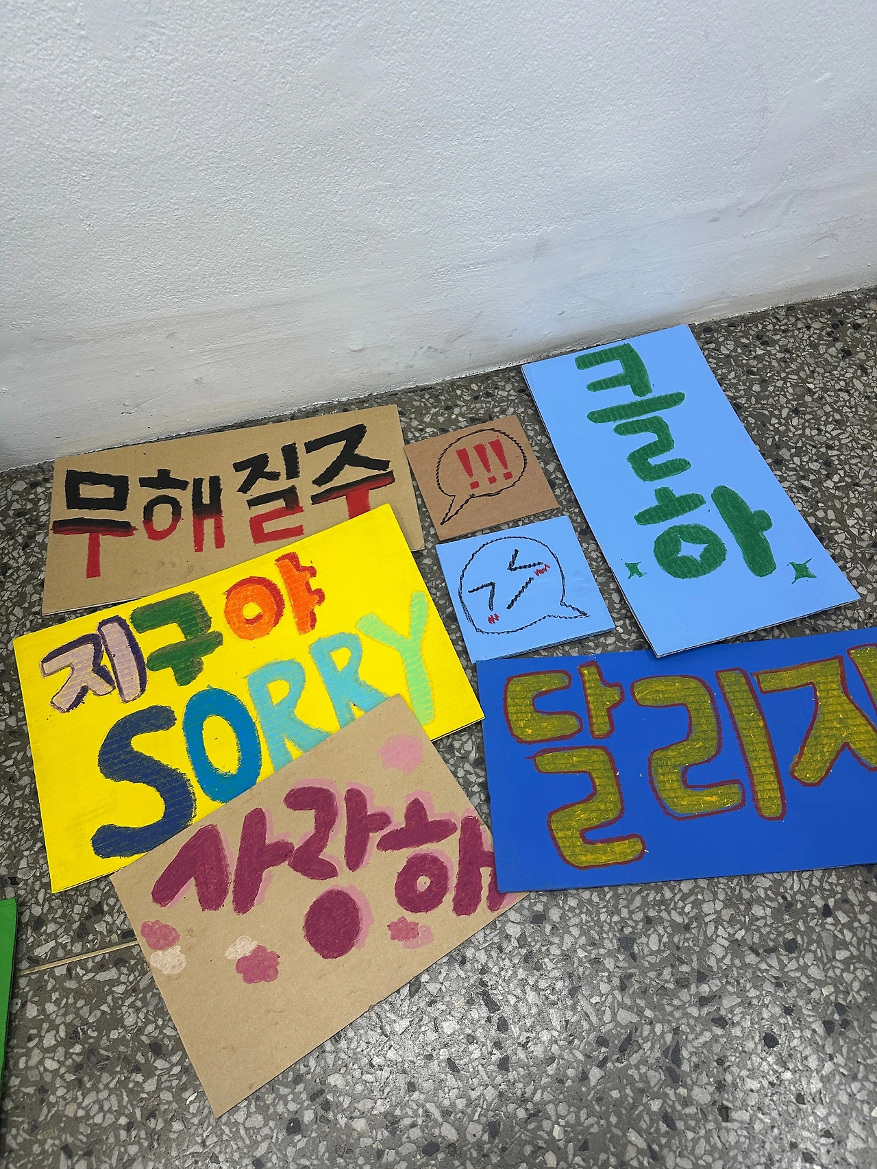 사면 중 한쪽 면은 여러 슬로건을 적은 피켓을 가득 붙이기로 했다. 지난 주말에 충주에서 작업한 피켓 외에 추가로 피켓을 제작했다. 다행히 와이퍼스에서 큰 회의실을 빌려주셔서 다 같이 작업할 수 있었다. 오일파스텔로 폐박스 위에 작업을 했는데 수채화처럼 번지는 느낌이 없어 색 조절 하기가 훨씬 수월해 재밌었다. 진짜 공장처럼 피켓을 만들어냈다.