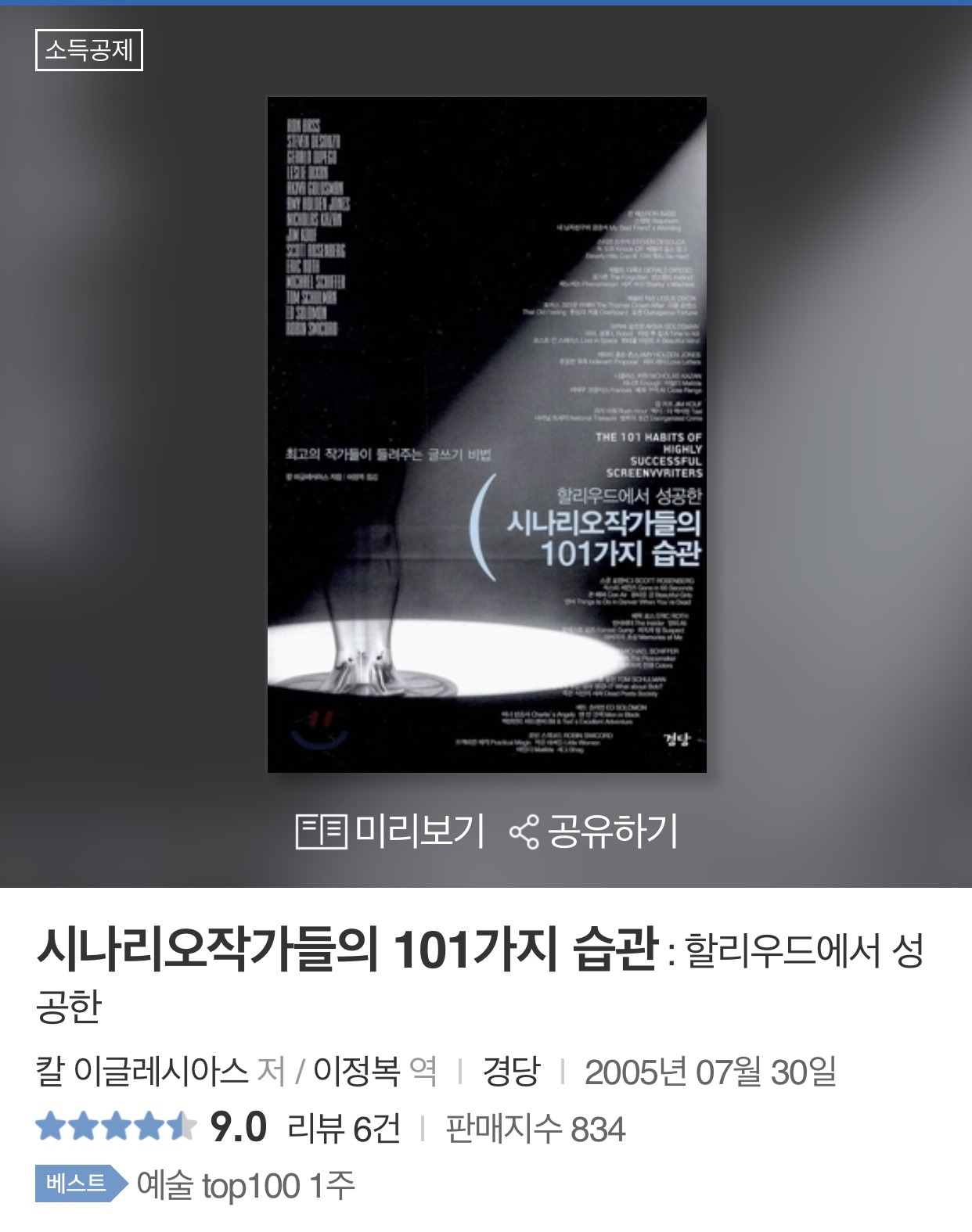 할리우드에서 성공한 시나리오작가들의 101가지 습관- 최고의 작가들이 들려주는 글쓰기 비법 이라는 책이 있다. 2005년, 경당 출판사에서 출간한 책이다.