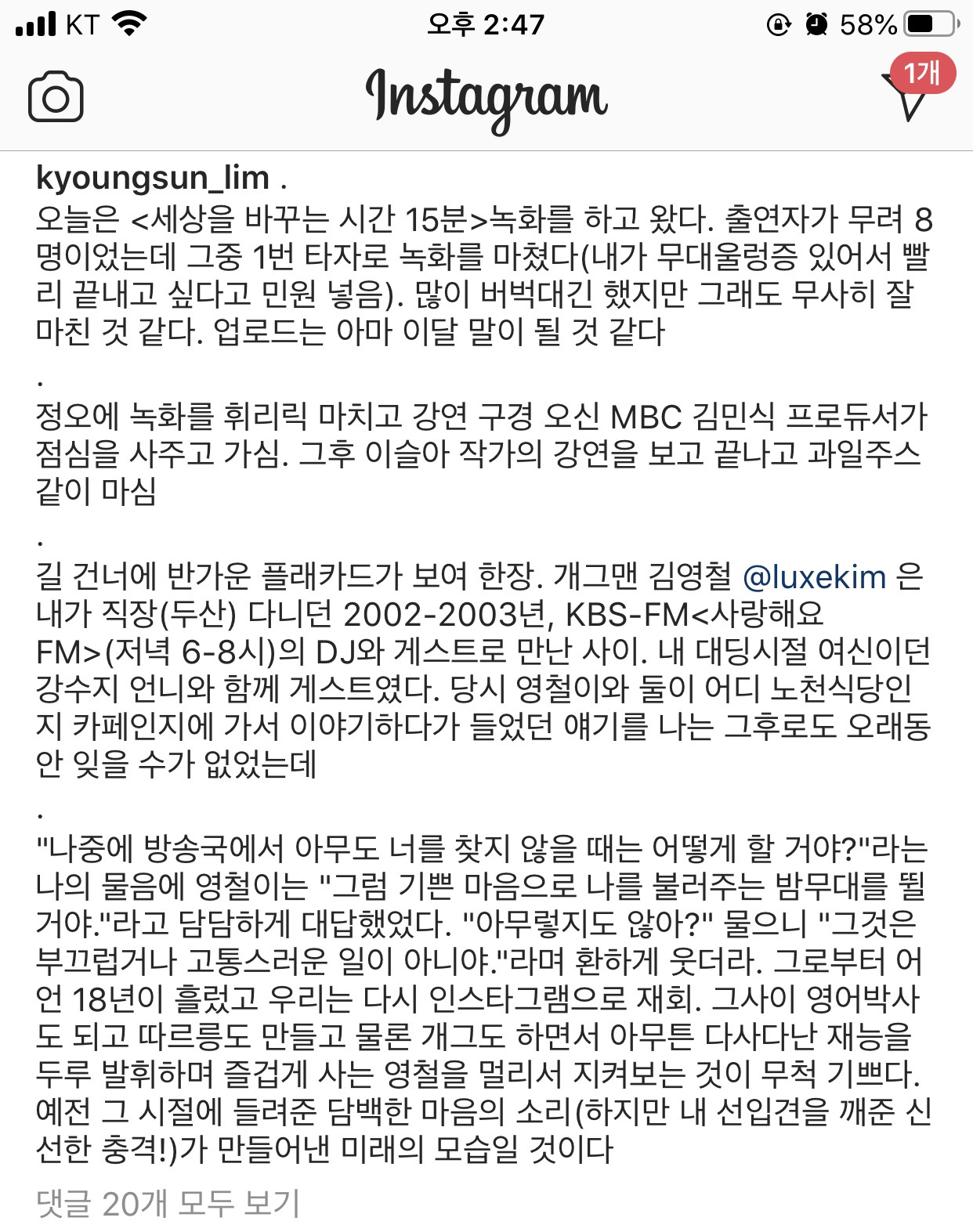[태도에 관하여], [여자로 살아가는 우리들에게]를 쓴 베스트셀러 작가 임경선 작가를 팔로우하고 있는데 그녀가 개그맨 김영철과 예전에 나눈 대화를 올린 글을 봤다.