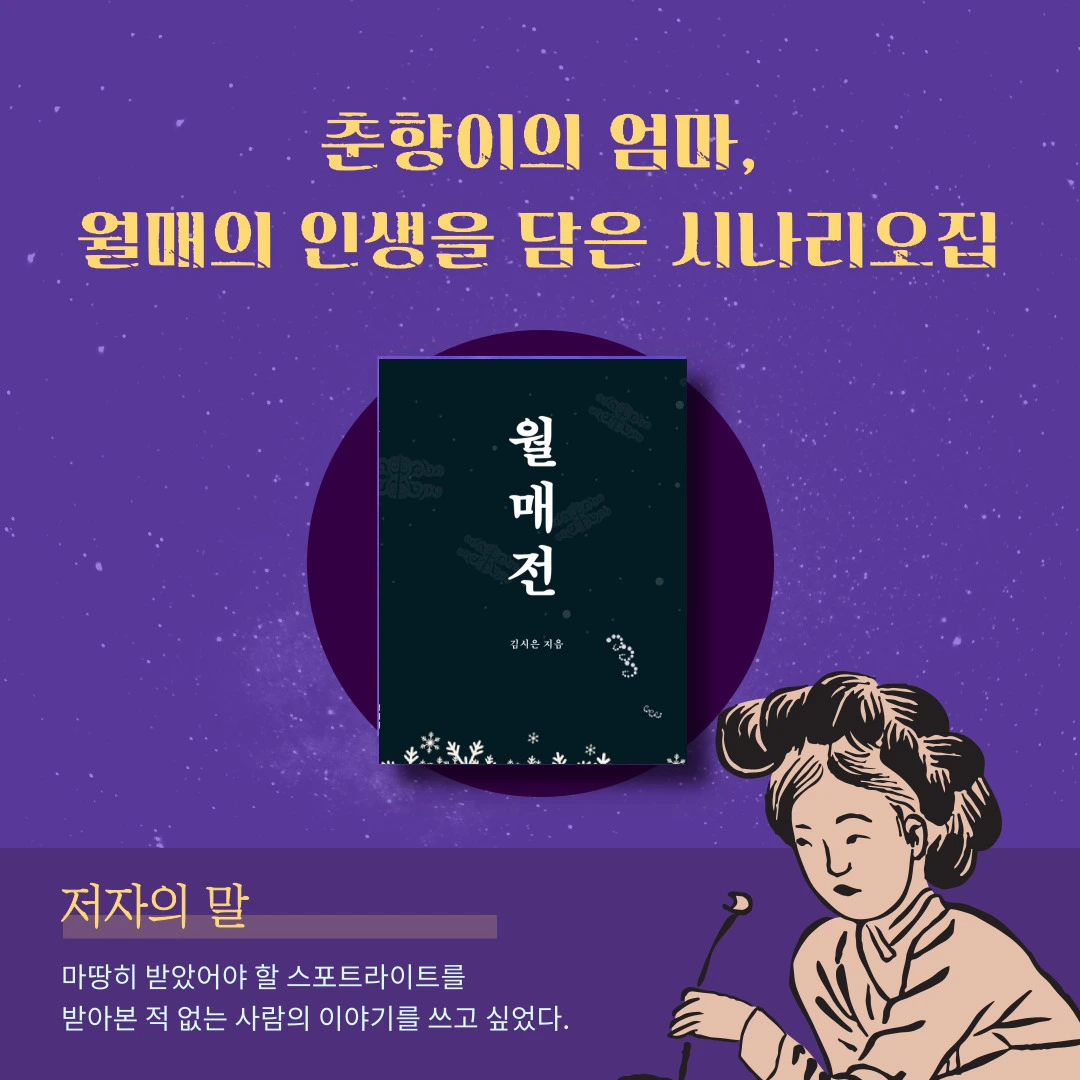 2013년, 스토킹 때문에 부산에서 서울로 도망치듯 독립. 시나리오 작가로 대성공하기를 꿈꿨지만 쉽지 않아 셀프 데뷔작 <월매전>(김앤작컴퍼니,2021)을 출간하였습니다.