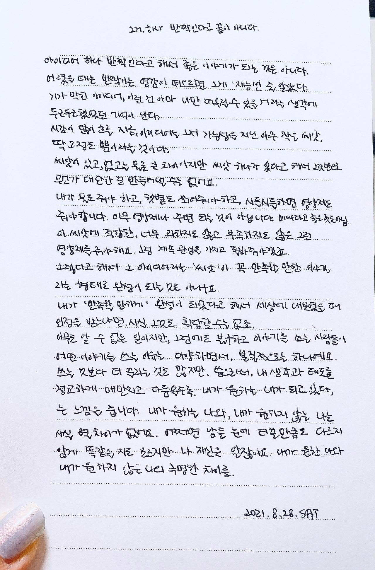세상에는 글을 쓰는 일보다 더 끌리고 재미있는 일도 많지만 글을 씀으로써, 내 생각과 태도를 정교하게 매만지게 되고, 그렇게 글을 통해 내 생각을 매만지고 다듬을수록 나는 ‘내가 원하는 나’가 되어가고 있다, 는 느낌을 준다.