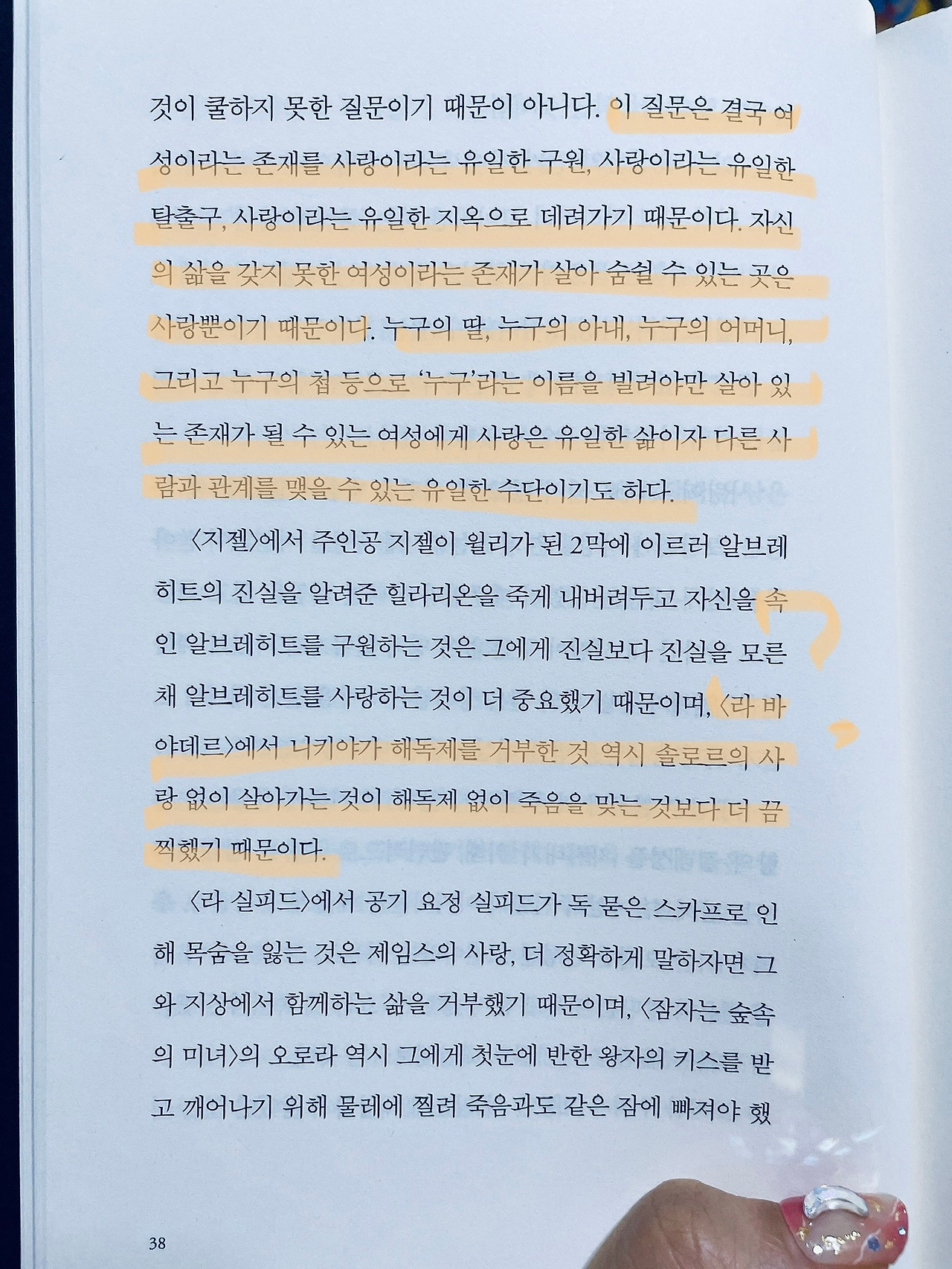 그러니 보통은 남자의 그늘 아래에서만 생존이 가능했고, 그 구조 때문에 사랑을 얻지 못하면 죽으려고 하는 여자 캐릭터를 불러내게 된 것이다.