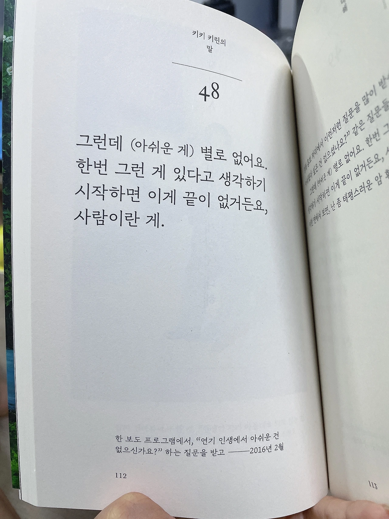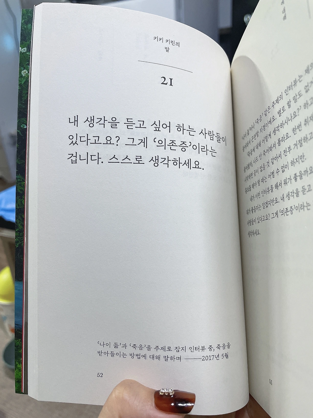 최근에는 ‘키키 키린’이라는 할머니의 책을 읽었다. 그녀가 글을 쓰는 사람은 아니었다. 그녀가 인터뷰나 시사회 등에서 했던 말들을 책으로 묶은 에세이집이다.