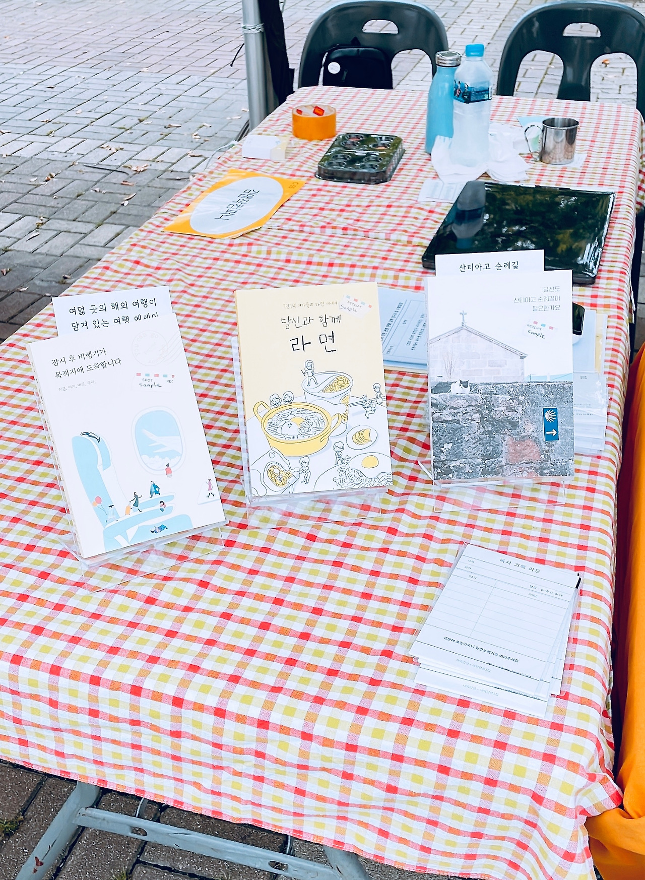 각종 홍보물, 책을 세워놓을 고정 도구, 테이블에 씌울 천 등도 준비해야 했고, 더불어 주차장에서 도서전이 열리는 지정 공간까지 책 수십 권을 옮겨야 했다(폴딩박스로 옮기긴 했지만). 그 더운 날에, 티와 속옷이 땀에 절도록 바쁘게 움직여야 했다.