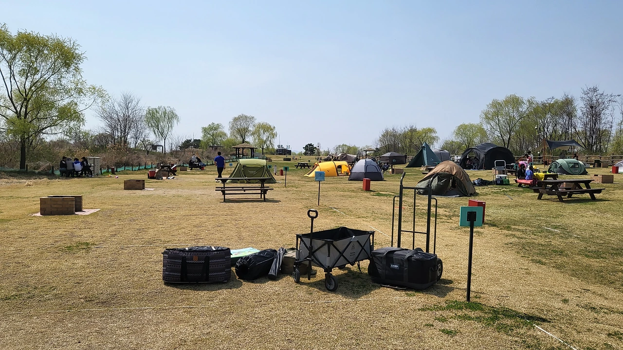 꼭 필요한 장비만 들고 간다고 생각했는데도 짐이 많아 주차장에서 캠핑 사이트까지 장비를 옮기느라 고생했다. 이미 땀이 비 오듯 했다. (여벌 옷도 없다구~) 저 짐을 나르고 이미 거의 방전 상태였다.
