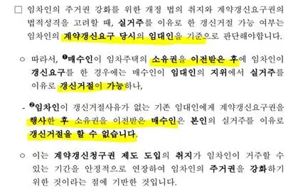 임차인의 계약갱신 요구 시점에 해당 주택을 구매한 임대인이 소유권 이전등기를 마쳤고 주택임대사업자가 아니라면, 계약갱신요구권을 거부할 수 있다는 것으로 해석할 수 있다. 이 경우 임차인은 잔여 거주기간만 채운 채, 사실상 5% 이상 보증금(전세, 월세)을 올리고 있을지 모르는 정글로 나서야 할 수 있다. 결국 정부가 임차인 스스로 권리를 찾으라며 총(계약갱신청구권)을 쥐어주곤 총알은 주지 않아, 임차인은 총알 없는 총의 방아쇠만 당기고 있는 셈으로 볼 수 있다.