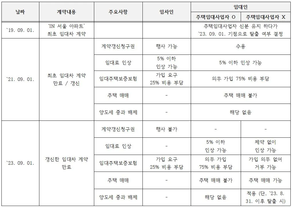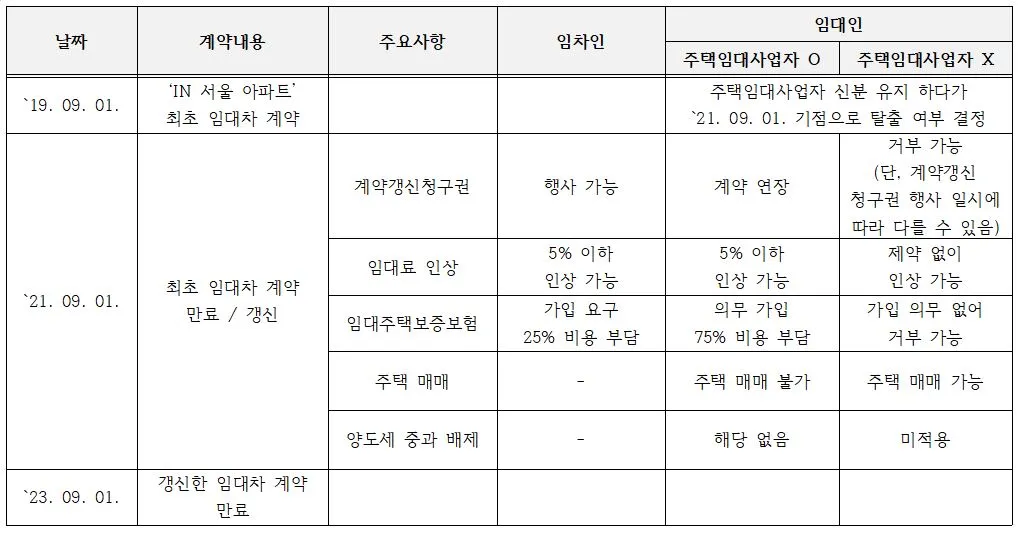 먼저 임대인이 최초 임대차 계약 당시(2019년 9월 1일) ‘단기(임대 의무기간 4년)’ 임대사업자인 경우다. 합리적 경제주체인 임대인은 항상 자신의 이익을 극대화하는 방향으로 행동한다. 주택임대사업자 신분 유지 여부를 선택할 때도 그럴 것이다. 정부가 아파트에 대한 주택임대사업자 제도를 폐지했고, 언제든 사업자 신분에서 탈출할 수 있게 해 사실상 자유를 얻었기 때문이다.