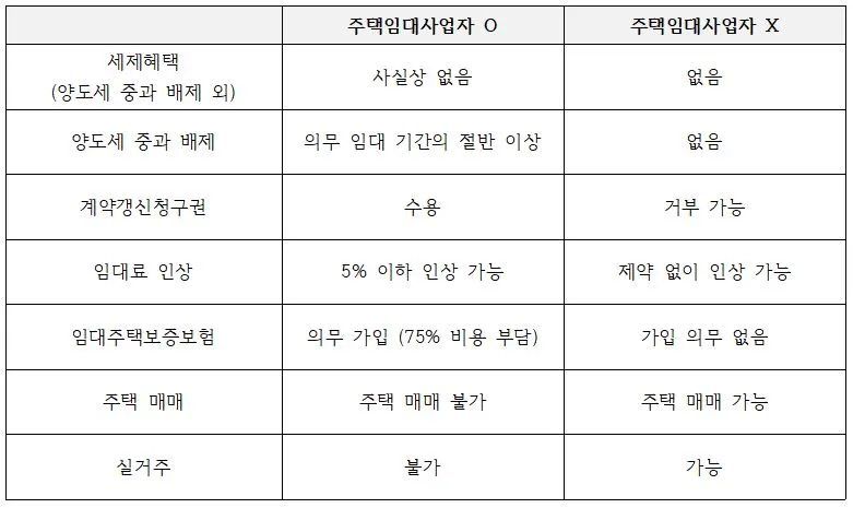 1. 임대인이 주택임대사업자 신분을 유지할 경우, 피부에 와 닿는 혜택은 ‘양도세 중과 배제’ 정도다. 이마저도 의무임대기간(단기의 경우 4년)의 절반인 2년 이상 보유하고, 임대주택 등록 말소 후 1년 이내에 해당 주택을 매매하였을 때나 가능하다. 반면 전월세 보증금 등 임대료를 최대 5%까지 올릴 수 있고, 임대주택 보증보험에 의무적으로 가입해야 하며, 2022년까진 부기등기도 수행해야 한다. 의무임대기간 동안에는 거래도 할 수 없으며, 실거주 목적으로 입주도 불가능하다. (4년 후 자동 탈출이니 실제론 일회성에 지나지 않는다.) 임차인은 계약갱신청구권을 행사해 2년 더 안정적으로 주택을 임차할 수 있으며, 임대인에게 보증보험 가입 의무가 생겨 보증금에 대한 불안감도 덜 수 있다.