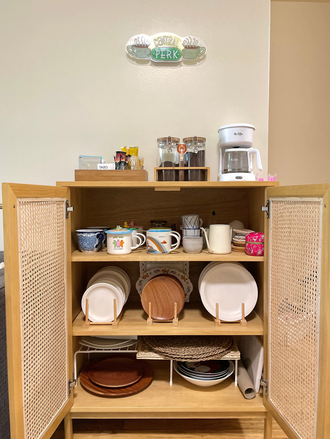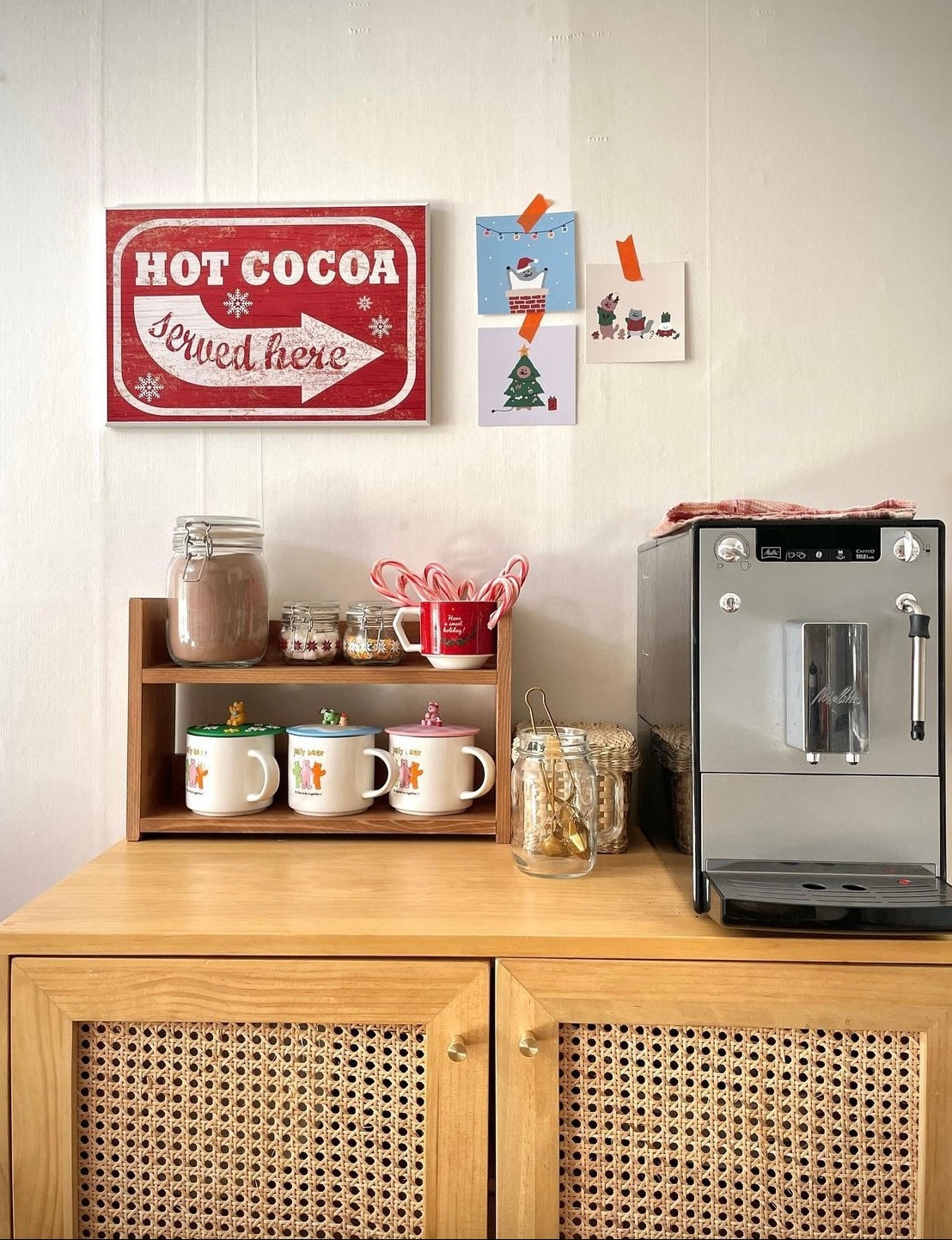 수납을 위한 가구를 사들일 때는 언제나 신중한 편인데, 커피는 우리 부부에게 생존과도 연결된(?) 특별한 존재이므로 커피만을 위한 제단을 만들기까진 오랜 시간이 걸리지 않았다. 실랑이 끝에 샀지만 안 샀으면 어쩔뻔 했나 싶은 에스프레소 머신과 각종 커피용품들이 살고 있고, 바로 꺼내 마실 수 있는 머그컵들이 함께 정리되어 있다. 각종 차와 꿀, 인스턴트 커피들도 셋방살이 하고 있으며 겨울이 되면 코코아 가루와 마시멜로가 추가되어 ’코코아 바‘로 변신한다. 아쉽게도 지금은 미국 생활 중이라 전압의 문제로 에스프레소 머신 대신 드립 커피 머신을 사용 중인데 일단 우리에겐 카페인을 섭취하는 행위가 중요하므로 만족하며 쓰고 있다.