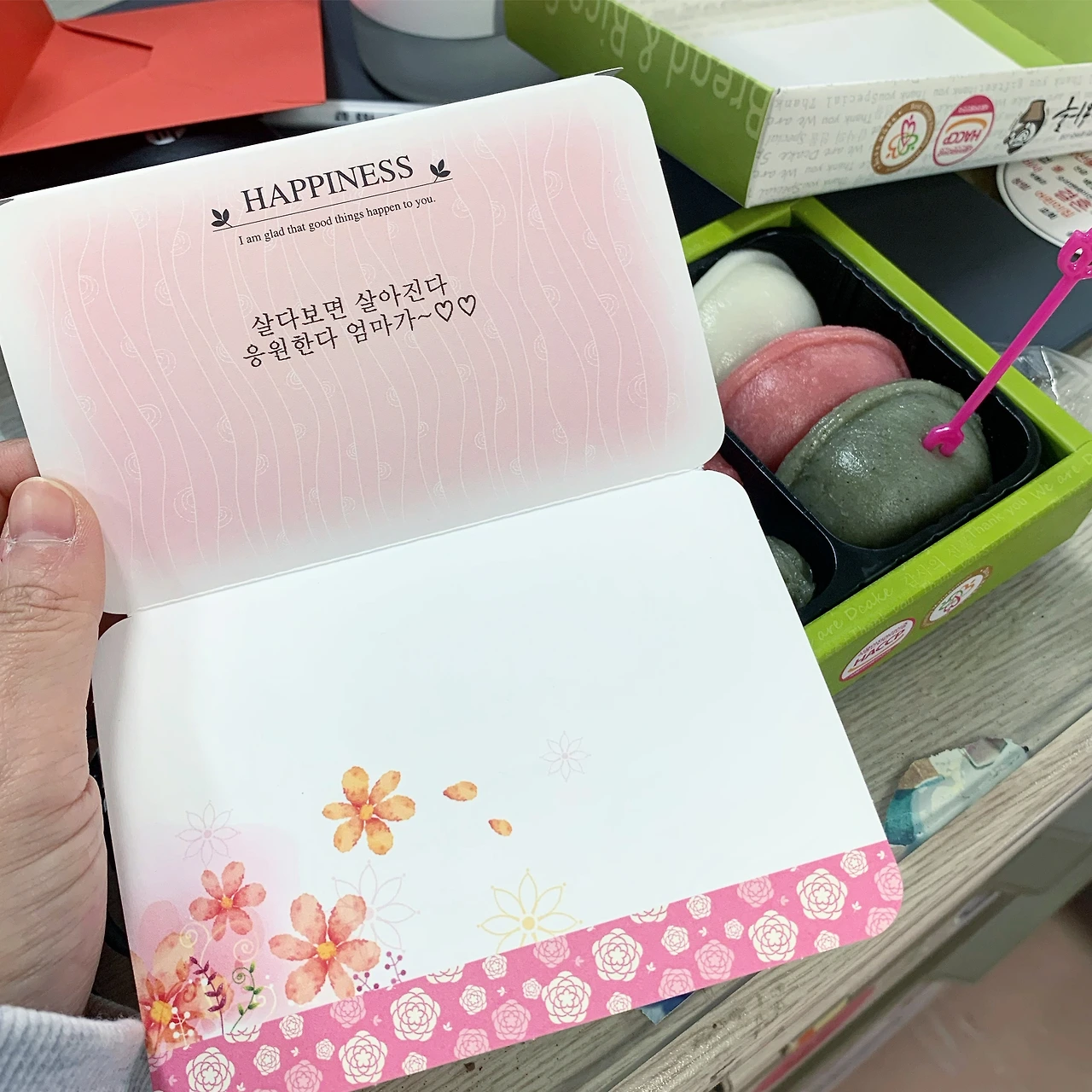 받은 걸 어쩐다. 주변에 계신 선배들, 팀 분들에게 떡을 돌리고 나도 먹었다. 깨끗이 다 먹고 약밥만 남았다. 나는 어렸을 때부터 약밥을 싫어했는데 엄마는 그것도 까먹었나 싶었다. 엄마는 카드도 보냈다. 봉투를 열어보니 카드에 업체가 프린트한 편지가 적혀 있었다.