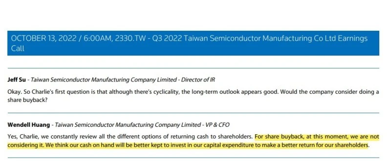 -TSMC는 매출급증에 따른 영업이익에 따른 현금자산이 많아진 상황입니다. 그렇기에 이 자금으로 주주가치를 높여주는 자사주 매입을 고려해볼 수 있지만 자본(설비)에 투자하는 것이 더 주주에게 이득이 될 것이라고 답하네요.