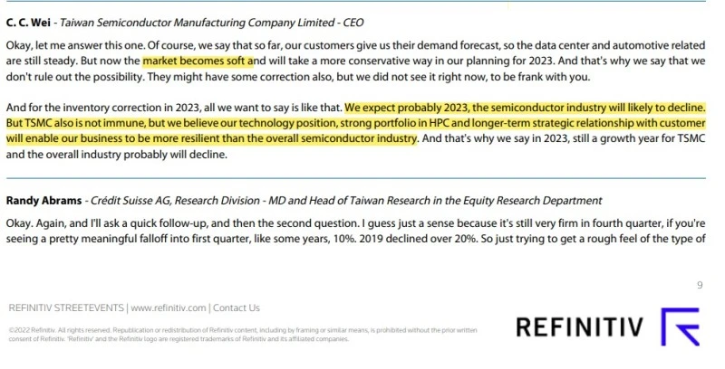 크레딧 스위스 RA의 질문에 이번엔 CEO인 C.C.WEI가 답변합니다. 재고순환으로 2023년은 아마도 반도체 산업이 쇠퇴할 것이다. TSMC도 예외없을 것이나 우리의 기술적 위치나 HPC 포트폴리오 부문에 강점을 갖고있고 고객사들과 장기적 관점을 형성하고 있기에 반도체 기업 중에선 잘 이겨낼 편이다.라고 합니다.
