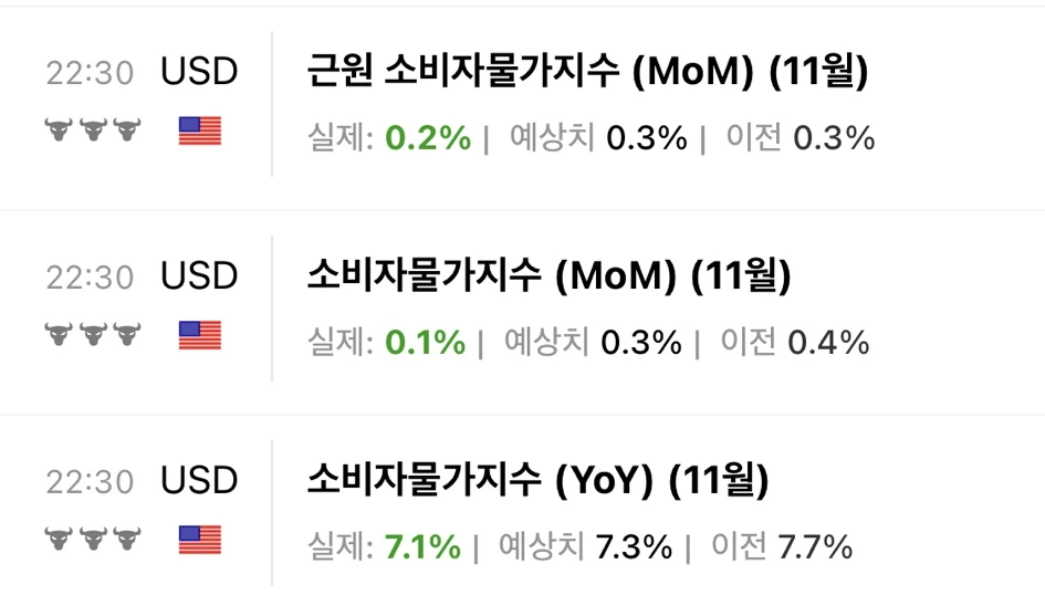 11월 미국 cpi 소비자물가지수가 한국시간 22:30에 나왔습니다.