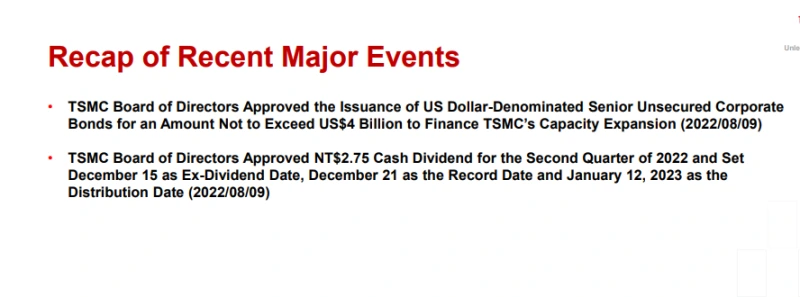 “TSMC 이사회는 역량 확대를 위해 40억 달러를 초과하지 않는 금액으로 달러 표시 선순위 무담보 회사채 발행을 승인했다.(2022/08.09)"