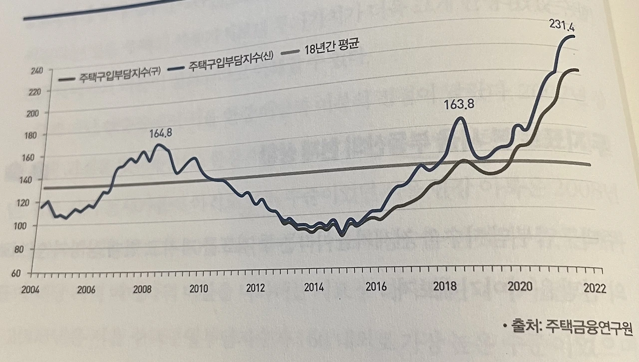 이 지수는 100이 기준인데 이 100의 의미는 소득의 25%를 주담대 원리금 상환에 쓴다는 것입니다. 2008 전고점에는 164, 즉 소득의 41%를 주담대 원리금 상황에 써야했고 2022.2분기 현재는 231로 소득의 58%를 상환에 사용해야 합니다. 20년 정도의 이 지수의 평균이 130 정도인데 선을 넘어도 한참 넘은 것이죠.