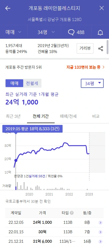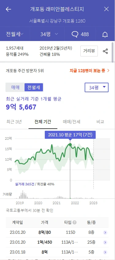 개포대장. 레미안블레스티지를 보면 19년 매매가는 18억에서 작년 30억 최고점을 찍고 24억까지 다시 떨어졌습니다. 전세가는 21년 10월 17억 최고점을 찍고 올해 1.18일 8억까지 10억 가까이 하락합니다. 결론은 하락장+입주물량 앞에는 최고부촌 강남도 장사없다는 겁니다.