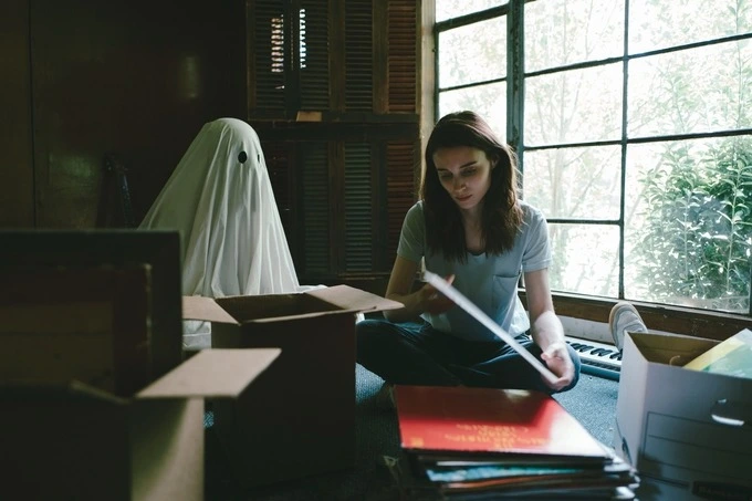 <고스트 스토리>는 살아있는 사람에 관한 영화다. 루니 마라와 케이시 에플렉이라는 할리우드의 빅 네임들이 주인공으로 나온다. 근데 제작비는 10만 달러로 초초초 저예산 영화에 속한다고 한다. 이런 초저예산 영화의 특성만큼이나 줄거리는 소박하다. C와 M은 다정한 신혼부부다. 근데 갑자기 남편 C가 교통사고로 사망하게 된다. M는 혼자 남겨졌다. 그렇게 C가 떠난 빈자리를 감당하며 일상을 보낸다. C는 이 빈자리를 조용히 관망하기만 한다. 유령이기 때문에 말도 무엇도 할 수 없다. 그가 떠난 빈 집에서 파이를 먹거나 사람들을 만나는 등 상처가 아무는 과정을 지켜보기만 하는 것이다. M은 그렇게 하루하루를 보내다 이내 집을 떠나야 한다고 생각한다. 이삿짐을 준비하는걸 전부 마무리한 M. 집을 떠나며 무언가 쪽지를 쓰고 벽에 묻는다. 유령이 된 C는 M이 떠난 후 벽을 열심히 파서 쪽지를 보게 된다.