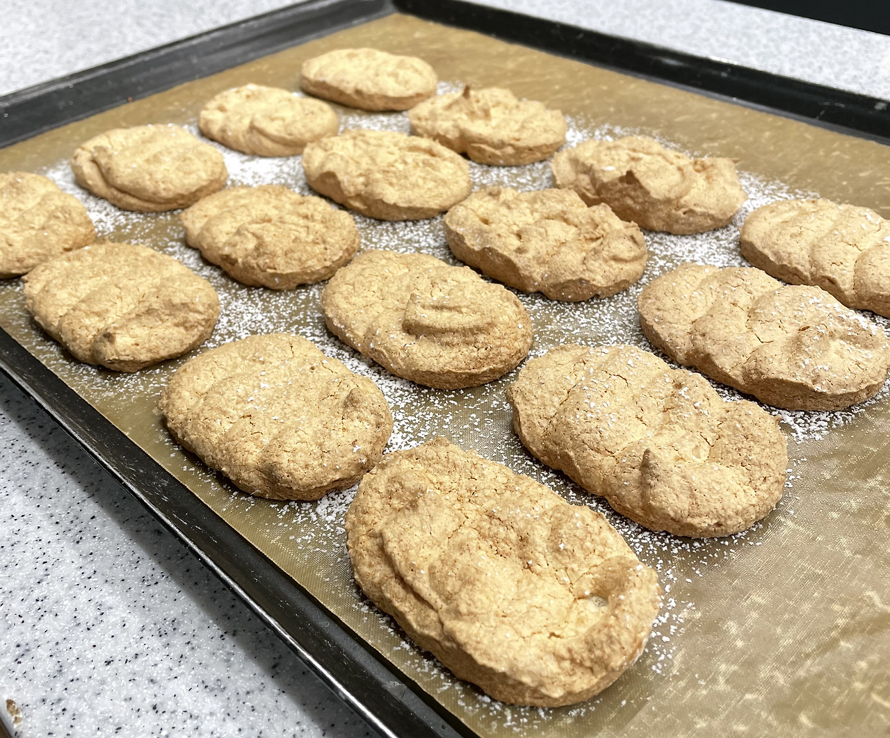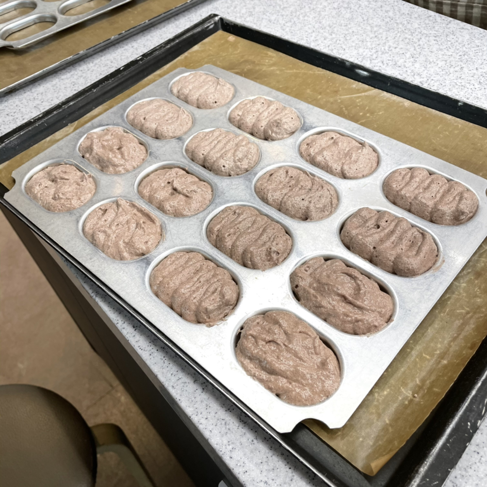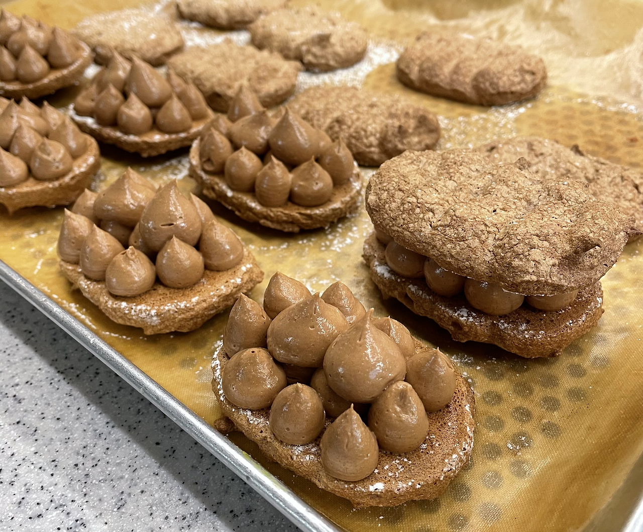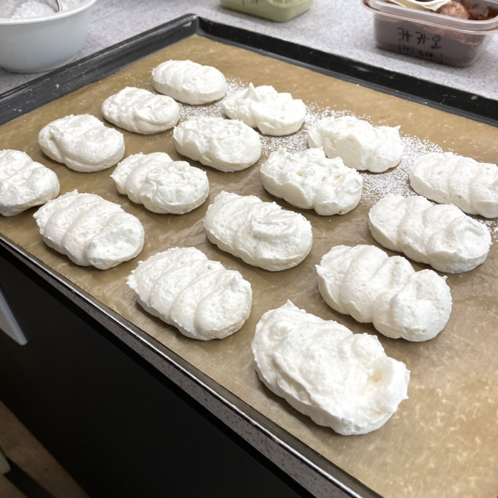 시트는 위 아랫면이 필요하다 보니 인절미, 초코, 녹차 순으로 꽤 여러 판을 짜고 구웠다. 여기서 마카롱과 다른 또 하나의 포인트는 굽기 전 슈가파우더를 솔솔 뿌려주는 것이다. 슈가파우더가 수분이 날아가지 않게 표면 막을 형성해 주어 다쿠아즈 특유의 겉파속폭(겉은 파삭 속은 폭신)의 식감이 만들어진다.