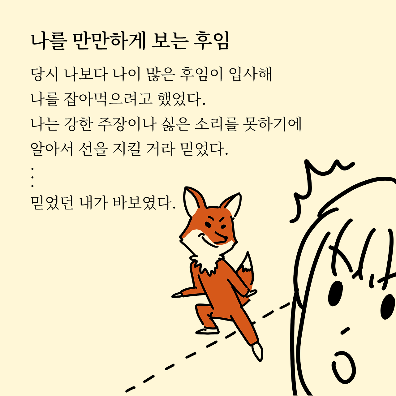 첫 번째는 만만하게 보는 후임을 상대하는 거였습니다. 머리가 빨리 회전되는 후임이었던 그분.. 곰 같은 제가 리드하기에는 버거웠습니다. 싫은 소리를 가뜩이나 못하는데 그 후임한테는 더 못하는 상황이 왔습니다. 다행히 팀장님이 저 대신해서 따끔하게 혼내기도, 가르치기도 했습니다. 당시 팀장님이 그렇게 도와주지 않았다면 저는 잡아먹혔을지도 모르겠습니다. 우리 서로 선은 지킵시다 :)