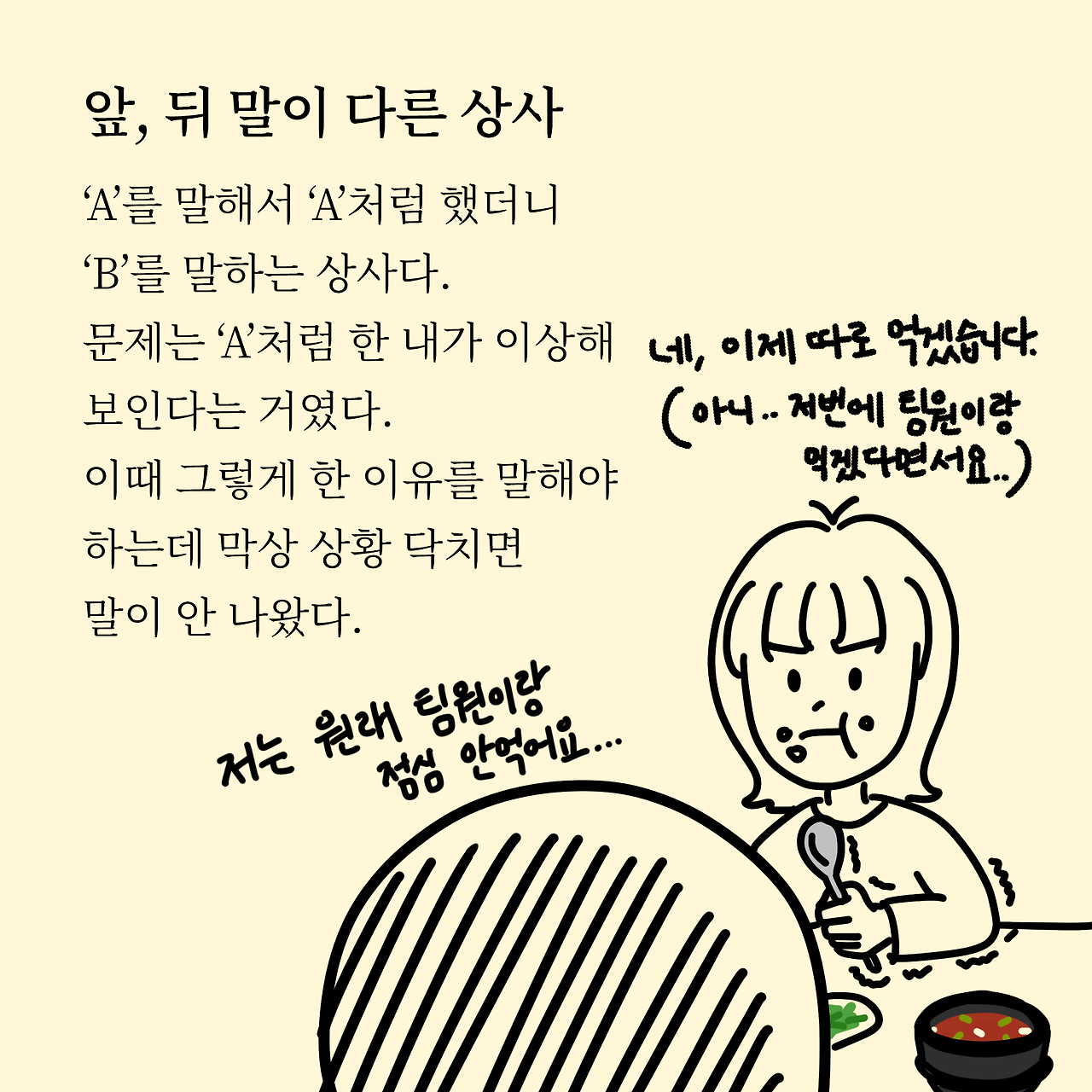 세 번째는 앞, 뒤 말이 다른 상사입니다. 말씀해주신 대로 했는데 혼 나신 적 있으신가요? 막상 그 상황에서 '네가 하라고 해서 했잖아.'라는 말이 나오기는 힘든 거 같습니다. 할 말 하는 거지만 어쨌든 윗사람이니 따지는 거 같고 그냥 넘어가야 조용할 거 같아 말을 삼키는 경우가 많았습니다. 그렇게 끙끙 앓이 게이지가 쌓이고 터지고를 반복했습니다.