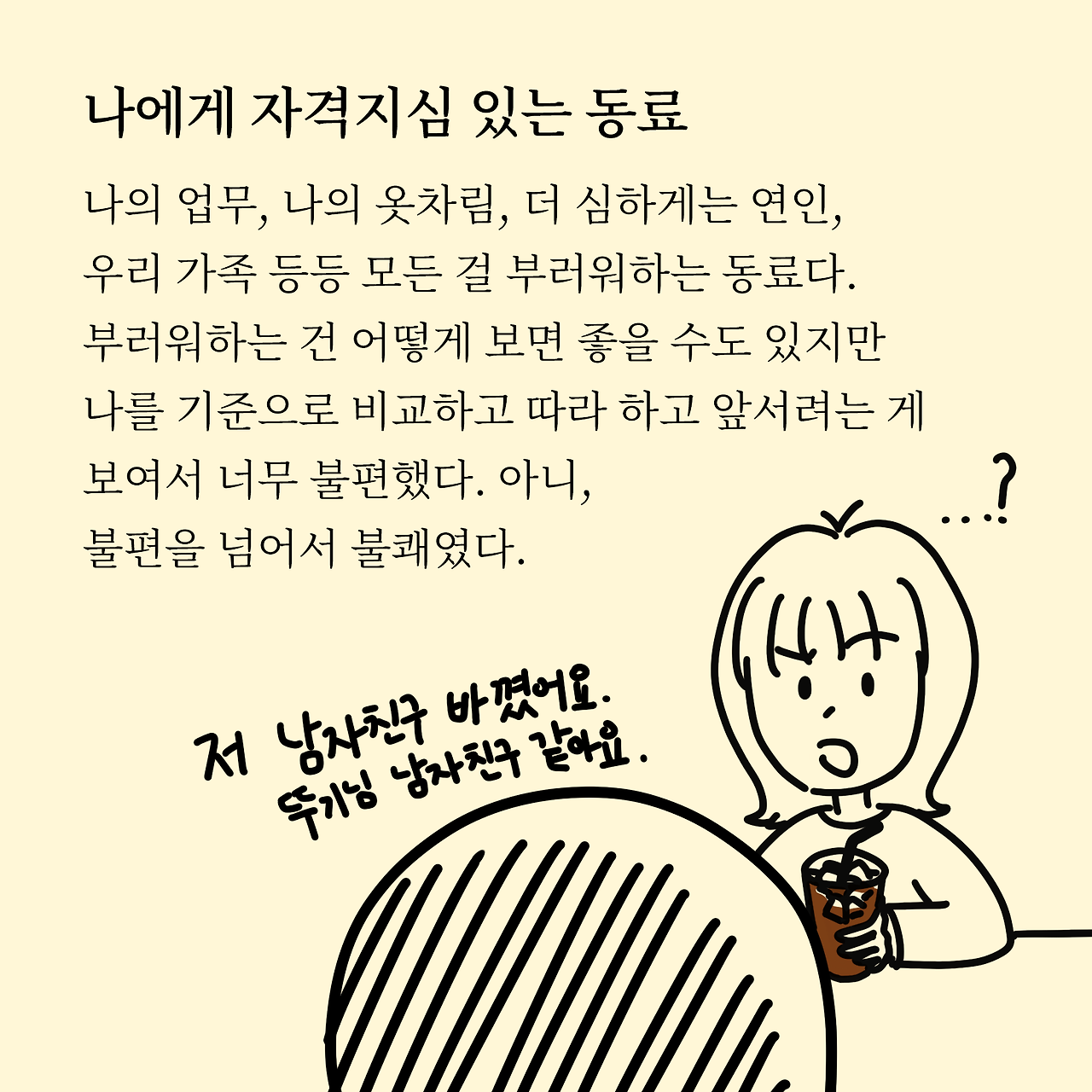 두 번째는 자격지심이 있는 동료였습니다. 저의 업무, 옷차림, 연인, 가족 등등 모든 걸 부러워했습니다. 저를 기준으로 비교하고 따라 하고 앞서려는 게 보여서 기분이 상할 때가 한두 번이 아니었어요. 결국, 이 동료와도 거리를 두게 됐는데 거리를 두니 괜찮은 사람처럼 보이더라고요. 사람은 너무 가까워도 안 좋고 적당한 거리가 있는 거 같습니다.
